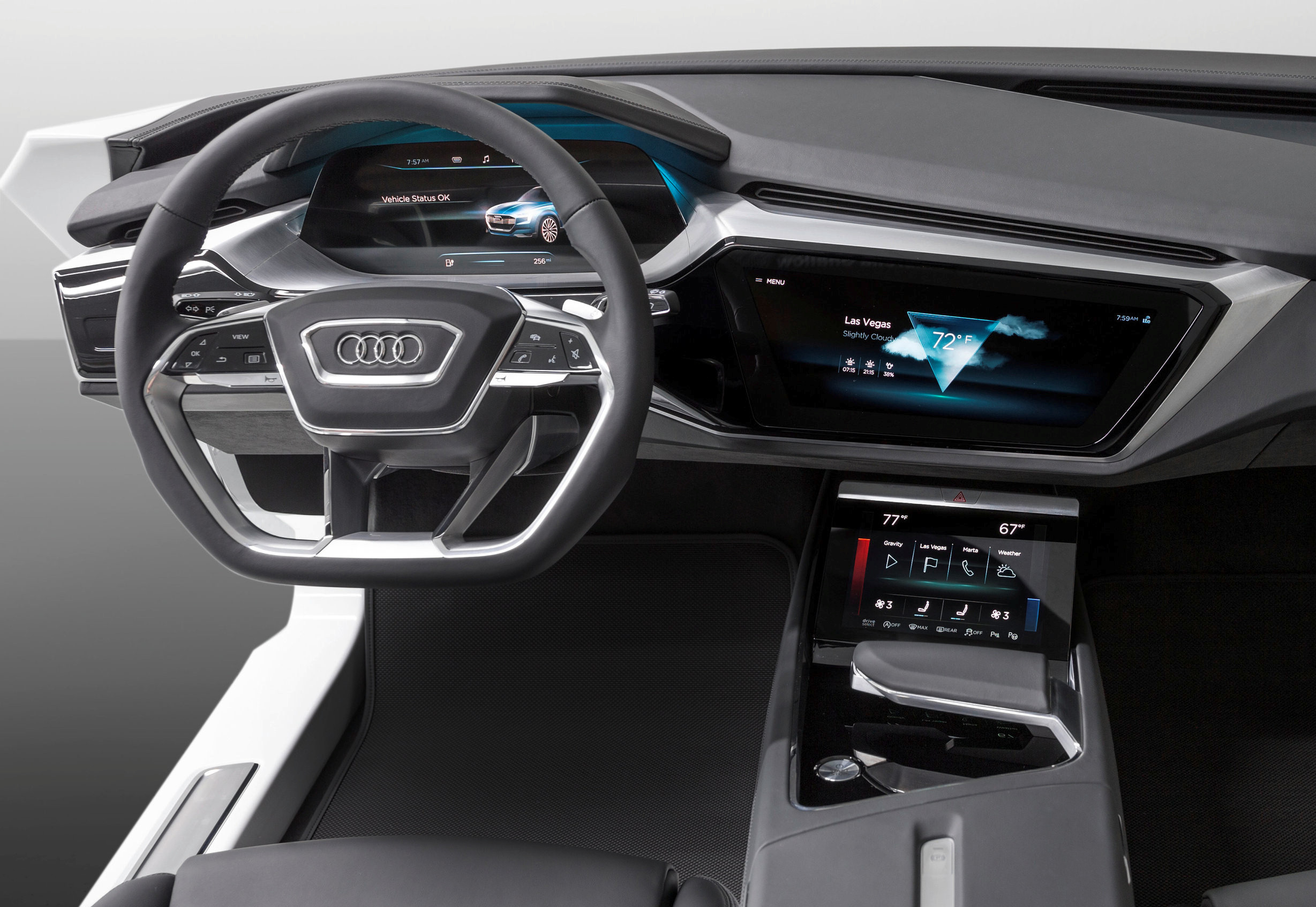 jAuf der diesjährigen CES präsentierte Audi sein neues Bedien- und Anzeigekonzept des E-Tron Quattro Concept. Das virtuelle Cockpit nennt Audi HMI (Human-Machine-Interface). Es setzt auf weniger Knöpfe, Rädchen, dafür umso mehr auf große touchbedienbare AMOLED-Displays (active-matrix organic light-emitting diode) und eine gute Vernetzung zu Smartphones und Online-Diensten, um den Fahrer gut durch den Tag zu lotsen.