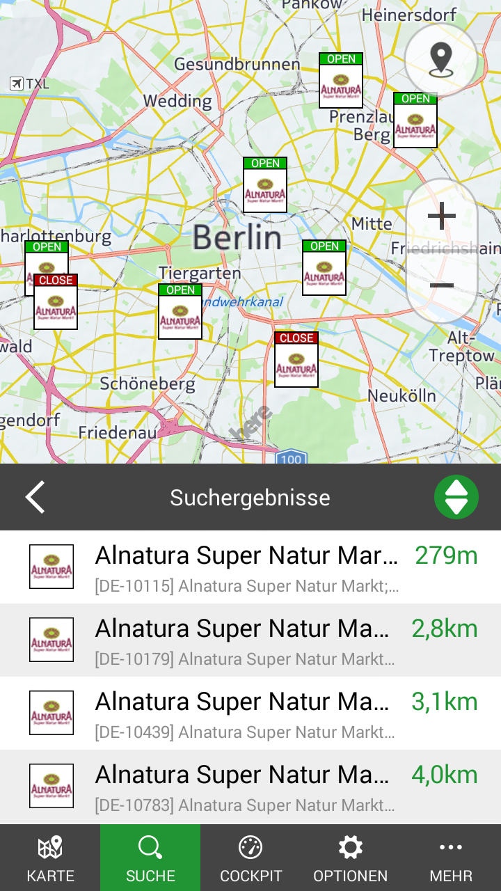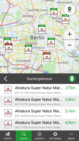 Die POIbase Android App zeigt direkt auf der Karte, ob eine Alnatura Filiale aktuell geöffnet oder geschlossen hat.