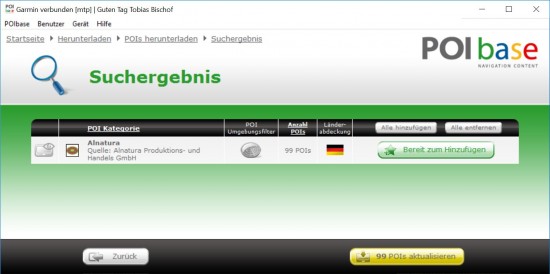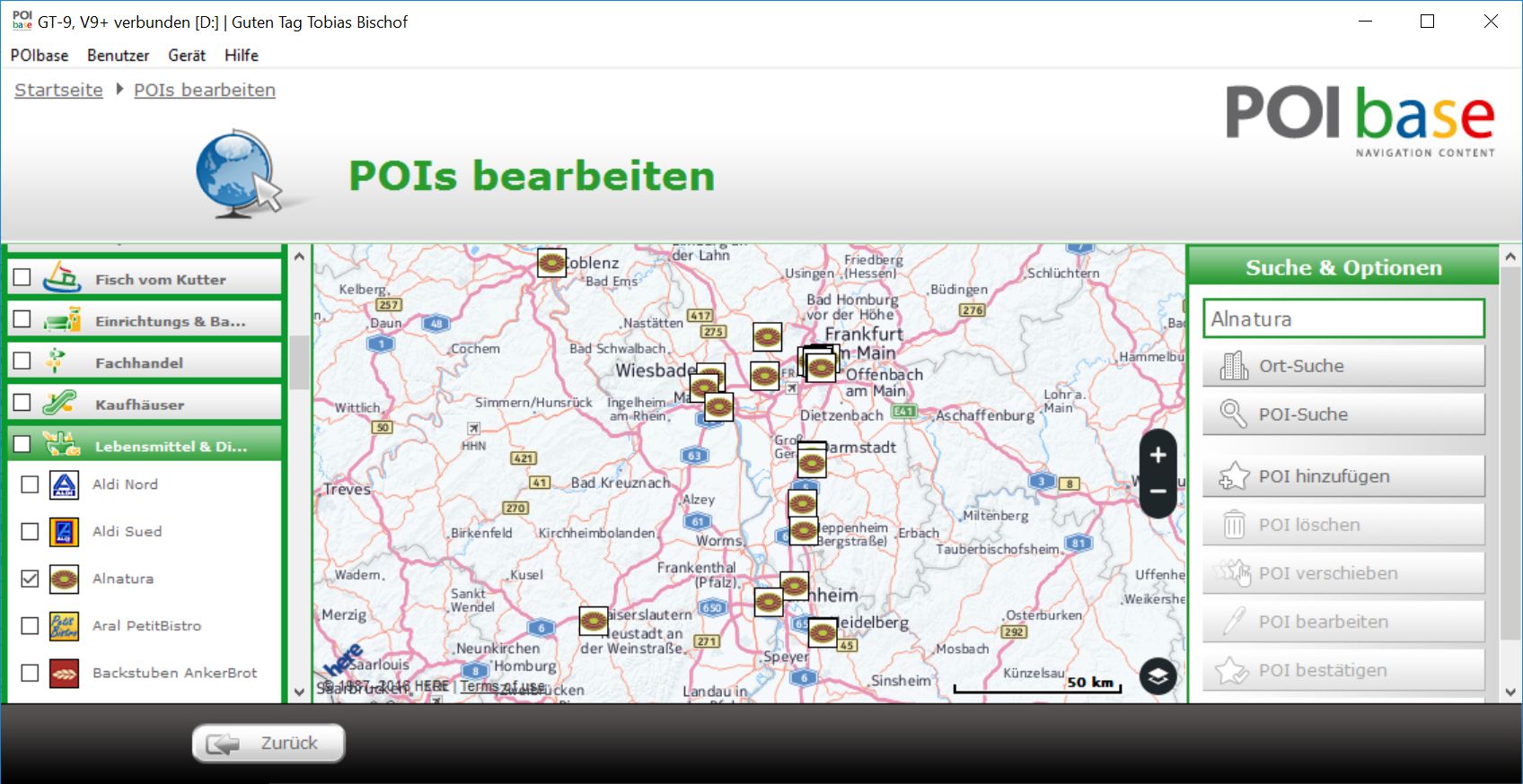 zur Auswahl hinzufügen. Alternativ kann auch nach „Alnatura“ gesucht werden. - Auswahl mit dem Button „POIs aktualisieren“ auf das Gerät oder den USB/SD-Speicher laden.