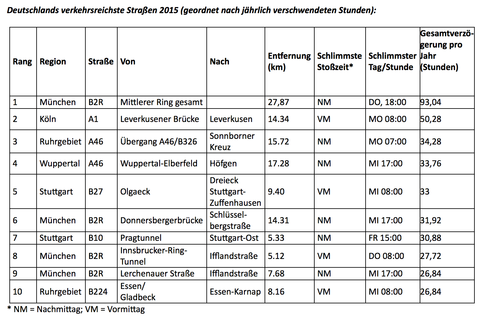 Auch die Verzögerung pro Jahr für einzelne Straßen hat INRIX berechnet. Die verkehrsreichste Straße in Deutschland ist der 28 Kilometer lange Münchner Ring (B2R) auf dem es im Jahr 2015 Verzögerungen von durchschnittlich 93 Stunden gab. Auf der zweitverkehrsreichsten Straße, der A1 in Köln lag die durchschnittliche Verzögerung hingegen bei nur 50 Stunden.