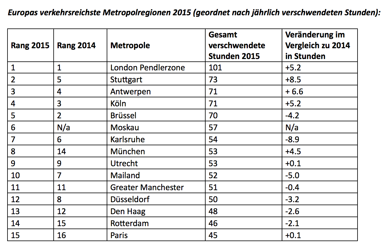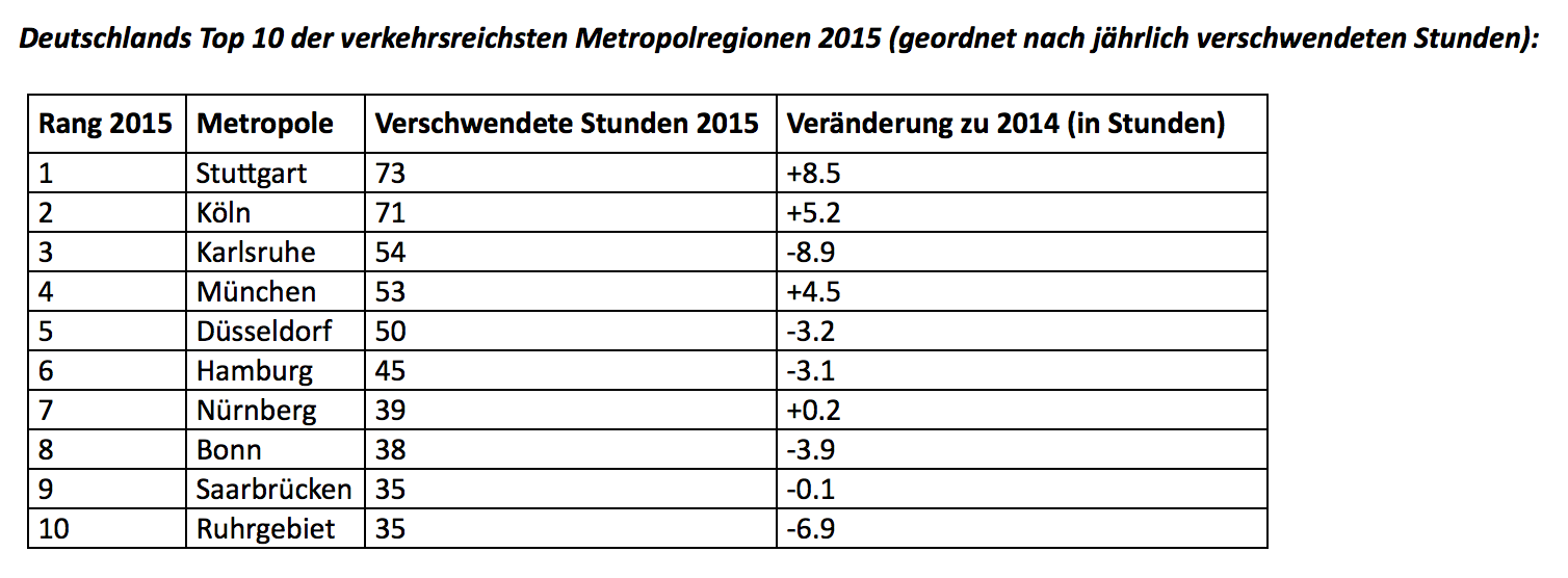 Von insgesamt 96 untersuchten Städten in Europa verzeichnete Stuttgart mit einem Plus von 14 Prozent im vergangenen Jahr den stärksten Anstieg an Verkehrsstaus. Autofahrer verbrachten hier durchschnittlich 73 Stunden im Stau, ein Anstieg von 8,5 Stunden im Vergleich zu 2014. Stuttgart stößt damit im deutschen Ranking die bisherige Stauhauptstadt Köln vom Thron. In der Liste der staureichsten Städte Europas rückte Stuttgart vom fünften auf den zweiten Platz vor. Unter den Europa-Top 10, die von London angeführt wird, finden sich neben Stuttgart und Köln auch die deutschen Städte Karlsruhe und Düsseldorf.