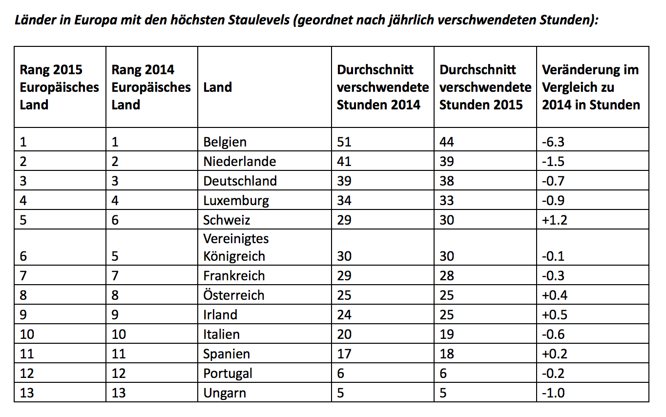 Deutschlandweit verbrachten Autofahrer 2015 im Durchschnitt 38 Stunden im Stau, eine Stunde weniger als im Vorjahr. Im dritten Jahr in Folge zählt Deutschland zu den drei verkehrsreichsten Ländern Europas. Das staureichste Land Europas ist auch weiterhin Belgien, dort werden durchschnittlich 44 Stunden im Stau verschwendet, gefolgt von den Niederländern, die etwa 39 Stunden im Jahr im Stau verbringen. Von den 13 analysierten europäischen Ländern verzeichneten im Jahr 2015 70 Prozent einen Rückgang an Staus. In den USA standen Autofahrer, von allen Ländern, die INRIX in seiner Traffic Scorecard erfasst, mit einem Durchschnitt von 50 Stunden am längsten im Stau.