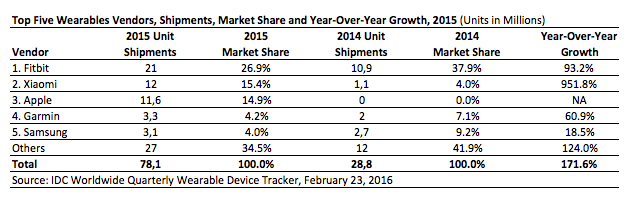 Alle Hersteller zusammen konnten im Jahr 2015 etwa 78,1 Millionen Wearables verkaufen. Mit 26,9 Prozent Marktanteil und 21 Millionen verkauften Geräten lag Fitbit auch hier klar vorne. Den zweiten Platz beanspruchte im Jahresvergleich allerdings Xiaomi mit 12 Millionen verkauften Geräten und 15,4 Prozent Marktanteil für sich. Trotz einem Rückstand von mehr als einem Quartal konnte Apple 2015 rund 11,6 Millionen Smartwatches verkaufen und sich einen Marktanteil von 14,9 Prozent sichern. Mit 3,3 Millionen Geräten und einem Marktanteil von 4,2 Prozent landet Garmin auf dem vierten Platz. Samsung konnte 2015 3,1 Millionen Wearable verkaufen und hält damit einen Anteil von 4,0 Prozent am Gesamtmarkt.