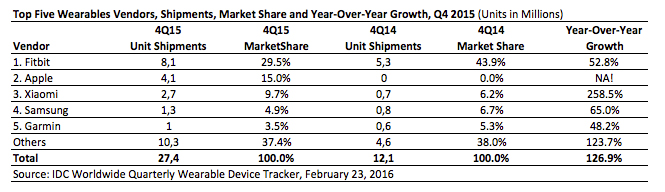 Marktführer bleibt auch weiterhin Fitbit mit 8,1 Millionen verkauften Geräten und einem Anteil von 29,5 Prozent, der im Vergleichbaren Zeitraum des Vorjahres allerdings noch bei rund 44,9 Prozent lag. Ausschlaggebend für den Rückgang soll vor allem die Apple Watch gewesen sein, die erst seit Ende April 2015 erhältlich ist. Mit seiner ersten und bislang einzigen Smartwatch beansprucht Apple laut der IDC-Erhebung 15 Prozent des Marktes für sich. Die Analysten gehen davon aus, dass im 4. Quartal 2015 etwa 4,1 Millionen Apple Watch verkauft werden konnten.