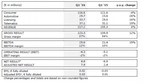 Im zurückliegenden Quartal konnte TomTom den Umsatz um rund sechs Prozent auf 217 Millionen Euro steigern. Noch immer mehr als die Hälfte (116,6 Millionen Euro) erwirtschaftet TomTom mit seinen Produkten für Endkunden, zu denen auch die mobilen Navigationssysteme und GPS-Sportuhren zählen. Im Vorjahr verdiente der Hersteller in diesem Geschäftsbereich noch 121,6 Millionen Euro, ein Minus von 4 Prozent.