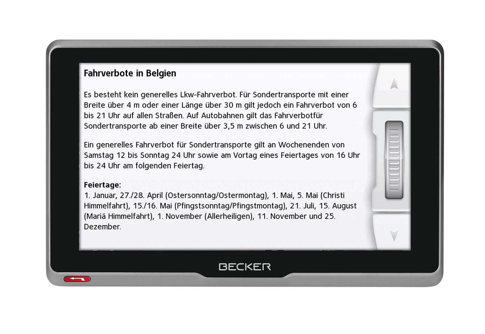 Das 6,2 Zoll Navi besitzt ebenfalls ein Display aus Echtglas, auf dem alle Informationen übersichtlich dargestellt werden. Für die sichere Telefonie während der Fahrt kann ein Smartphone per Bluetooth mit dem Navi verbunden werden. Auch bei der Bedienung des Gerätes muss der Fahrer die Hände nicht vom Lenker nehmen, denn viele Funktionen lassen sich per Sprachbefehl steuern. Ebenfalls vorhanden ist der Becker Connect Service, welcher Echtzeit Verkehrsmeldungen, Informationen zu Sonderzielen und Kartenupdates direkt auf dem Gerät umfasst.