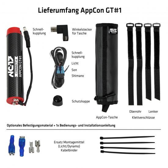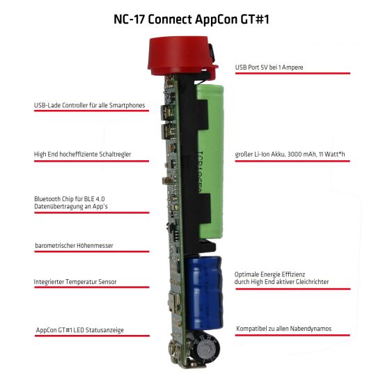 Eine solche Lösung bietet die Firma NC-17 mit dem APPCON GT #1 an. Das Produkt wird bereits seit einiger Zeit auch unter dem Namen Dynamo Harvester vertrieben. APPCON GT #1 nimmt die Energie des Nabendynamos als Wechselspannung auf, erzeugt eine Gleichspannung und lädt damit seinen internen 3000 mAh starken Pufferakku. Über eine USB-A-Buchse können USB-Verbraucher angeschlossen und geladen werden. Optional kann APPCON GT #1 über Bluetooth mit einem Smartphone (Android iOS) gekoppelt werden. Über den Dynamo kann die Anzahl der Radumdrehungen gezählt und Geschwindigkeit sowie Entfernung zuverlässig ermittelt werden. Die App dient gleichzeitig als Fahrradtacho und zeichnet Touren selbstständig über GPS auf.