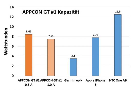 Nicht direkt über den USB-Port verbrauchte Energie wird im internen 3000-mAh-Lithium-Ionen-Akku gespeichert. Der Akku besitzt auf dem Datenblatt eine Kapazität von 11,1 Wattstunden. Natürlich gibt es bei der Umwandlung der Akkuspannung in die 5-Volt-Ausgangsspannung immer Verluste. Um den Akku zu schonen, wird die Entladung in der Regel etwas früher beendet, was ebenfalls dazu beiträgt, dass die in der Praxis nutzbare Kapazität etwas geringer ausfällt. Wir haben den APPCON GT #1 wie unsere sonstigen Powerbanks (siehe Vergleichstest) getestet und folgende Werte für die Kapazität ermittelt: