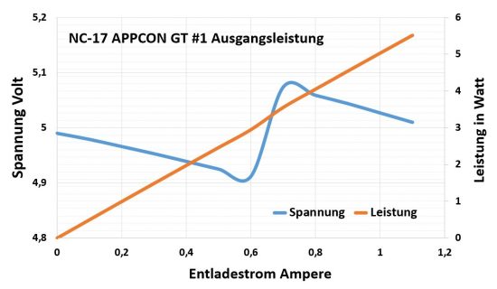 APPCON GT #1 verfügt über nur einen USB-Ausgang, welcher vom Hersteller mit einer Ausgangsleistung von 5 Watt (1 Ampere x 5 Volt) spezifiziert ist. Wir haben folgende Leistung und Spannung gemessen (bei vollem Akku und ohne Eingangsleistung):
