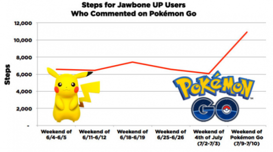 Dies bestätigte nun auch der Fitness-Tracker-Hersteller Jawbone, der jüngst eine Statistik veröffentlichte, die eben dieses belegt: Pokémon-Spieler legen an Wochenenden, an denen sie Pokémon-Go spielen, im Schnitt 63 Prozent mehr Schritte zurück als ohne das Spiel.