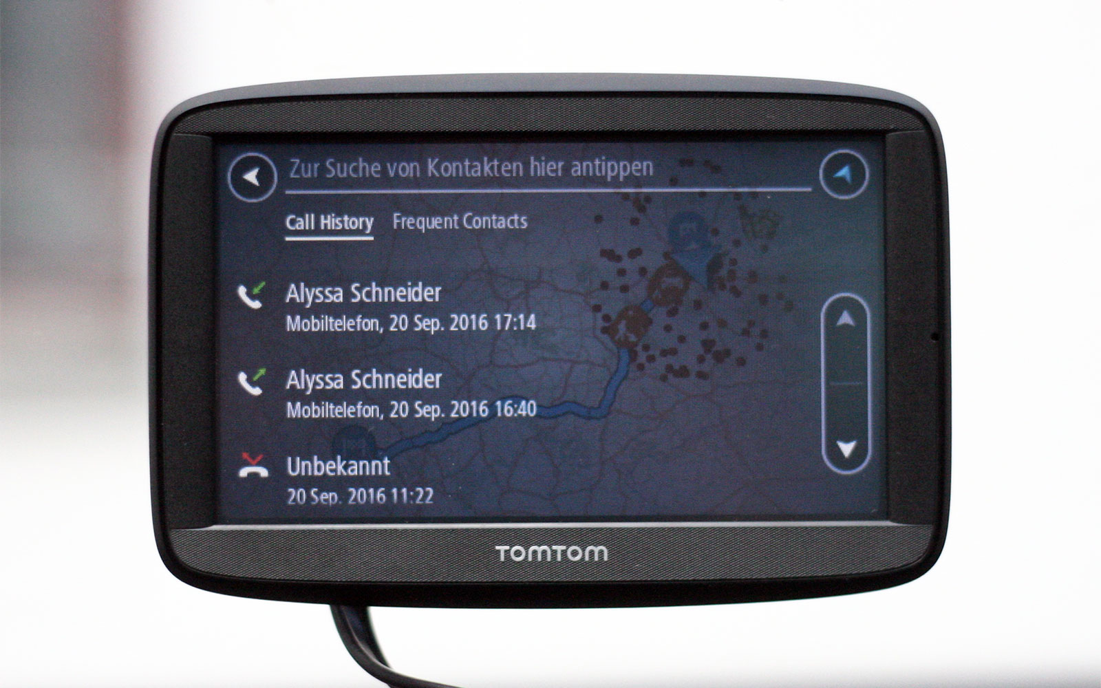 In Verbindung mit einem Smartphone können das TomTom VIA 52 und TomTom VIA 62 auch als Freisprecheinrichtung verwendet werden. Die Annahme von eingehenden Anrufen und das Wählen von Kontakten kann dann direkt über das Gerät vorgenommen werden. Gefehlt hat uns ein Zugriff auf Favoriten sowie die Möglichkeit, eine nicht im Telefonbuch vorhandene Nummer eingeben zu können. Leider muss für den Aufruf des Telefonbuchs das Navi mit der Hand bedient werden, eine Verknüpfung mit der Sprachsteuerung gibt es nicht. Die Qualität der Telefonate lässt vor allem auf Seiten des anderen Gesprächspartners zu wünschen übrig und ist häufig zu leise. Wahrscheinlich ist das verbaute Mikrofon einfach zu schwach, was auch die bereits beschriebenen Schwierigkeiten mit der Sprachsteuerung erklären würde. Das Vorlesen von eingehenden SMS oder anderen Nachrichten hat TomTom erst für die neue GO-Modelle vorgesehen, die auf der IFA vorgestellt wurden.
