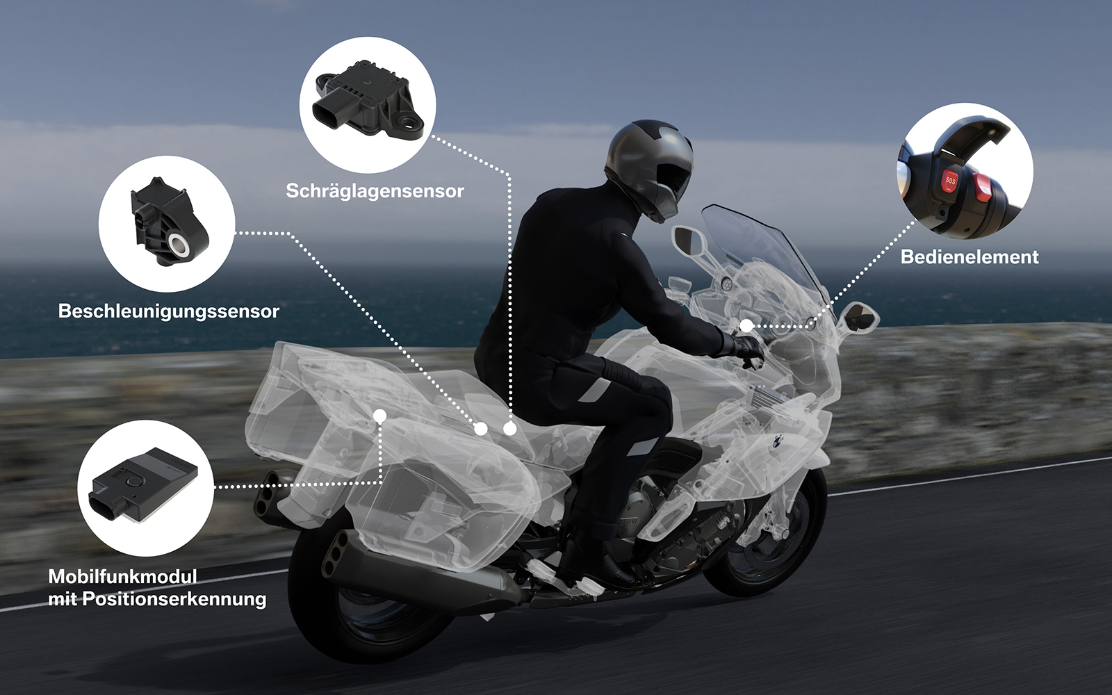 Das Notrufsystem ist unter dem Sitz der BMW K 1600 GT verbaut und registriert über verschiedene Beschleunigungs- und Schräglagesensoren die genau Position des Motorrads. Bei einem Unfall kann automatisch oder über eine SOS-Taste am Lenker des Motorrads das BMW-Callcenter informiert werden. Gleichzeitig wird eine Sprachverbindung zu einem Mitarbeiter aufgebaut, der zusätzlich die genauen GPS-Positionsdaten und Angaben zu Fahrtrichtung des Motorrads einsehen kann. Bei einem schweren Unfall aktiviert das BMW-Callcenter die Rettungskette und hält bis zum Eintreffen der Helfer am Unfallort Kontakt zum verunglückten Fahrer.