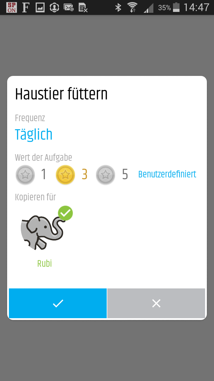 Die Umsetzung in der App ist durchaus gelungen. Das System ist sehr flexibel und kann an individuelle Aufgaben und Belohnungen gut angepasst werden. Es wäre sogar denkbar, die Währung direkt in z.B. Cent umzurechnen und als Taschengeld zu verwenden. Durch das Erledigen der Aufgaben ergibt sich so das wöchentliche Taschengeld, wurden Aufgaben nicht erledigt, reduziert sich das Taschengeld entsprechend. Am Ende der Woche wird das Taschengeld ausgezahlt und das digitale Sparschwein geleert.
