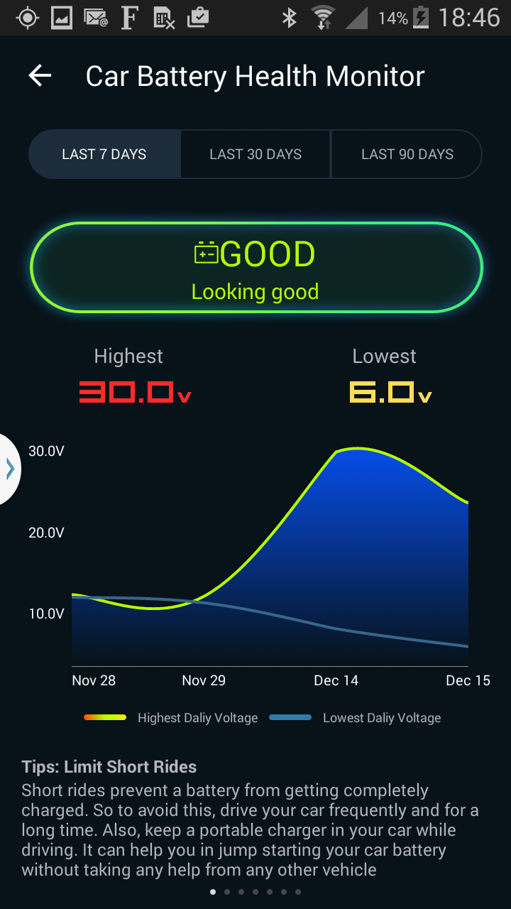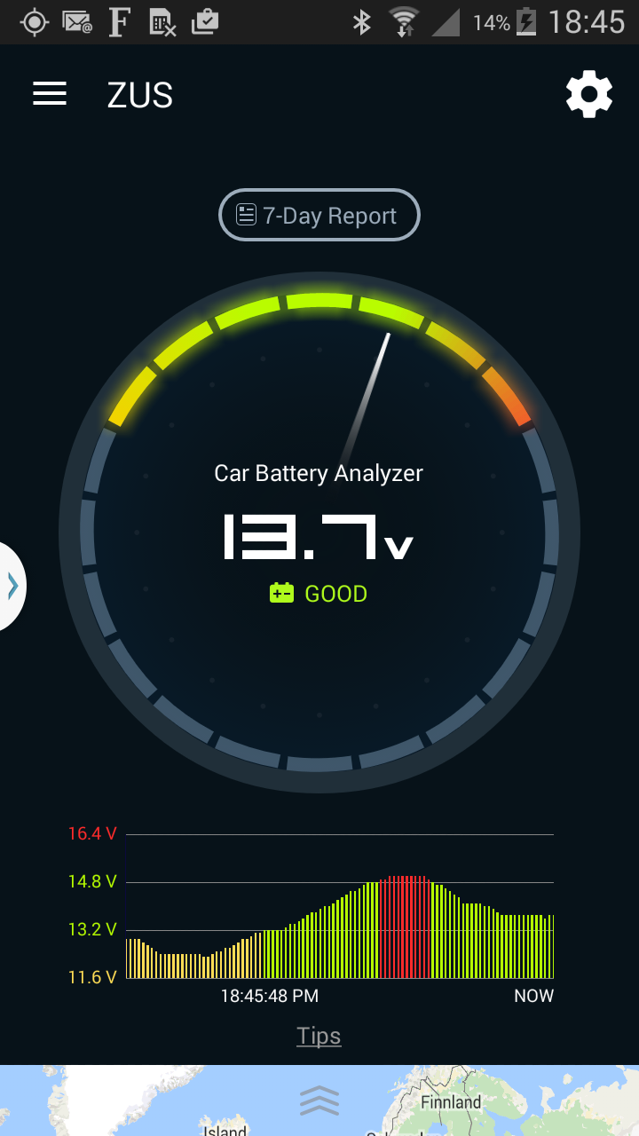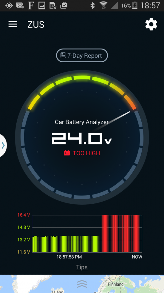 In der Praxis reicht die Messgenauigkeit jedoch locker aus, um eine gute Übersicht über den Zustand der Bordbatterie zu erhalten und eine schwache Batterie frühzeitig zu erkennen. Die Batteriezustandsanzeige in der App ist allerdings fest auf 12-Volt Batterien ausgelegt. Nutzt man den ZUS Car Charger daher in einem LKW mit einer Bordspannung von 24 Volt (zulässige Eingangsspannung 12 bis 24 Volt), warnt die App fälschlicherweise vor einer zu hohen Batteriespannung.