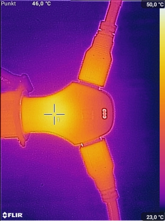 Durch den hohen Wirkungsgrad erwärmt sich der ZUS Car Charger auch bei hoher Belastung kaum. Das Wärmebild zeigt im Dauerbetrieb (im Test nach zwei Stunden) und bei einer Belastung im Bereich der Nennleistung (2 x 2,4 Ampere) nur eine maximale Temperatur von ca. 46 °C.