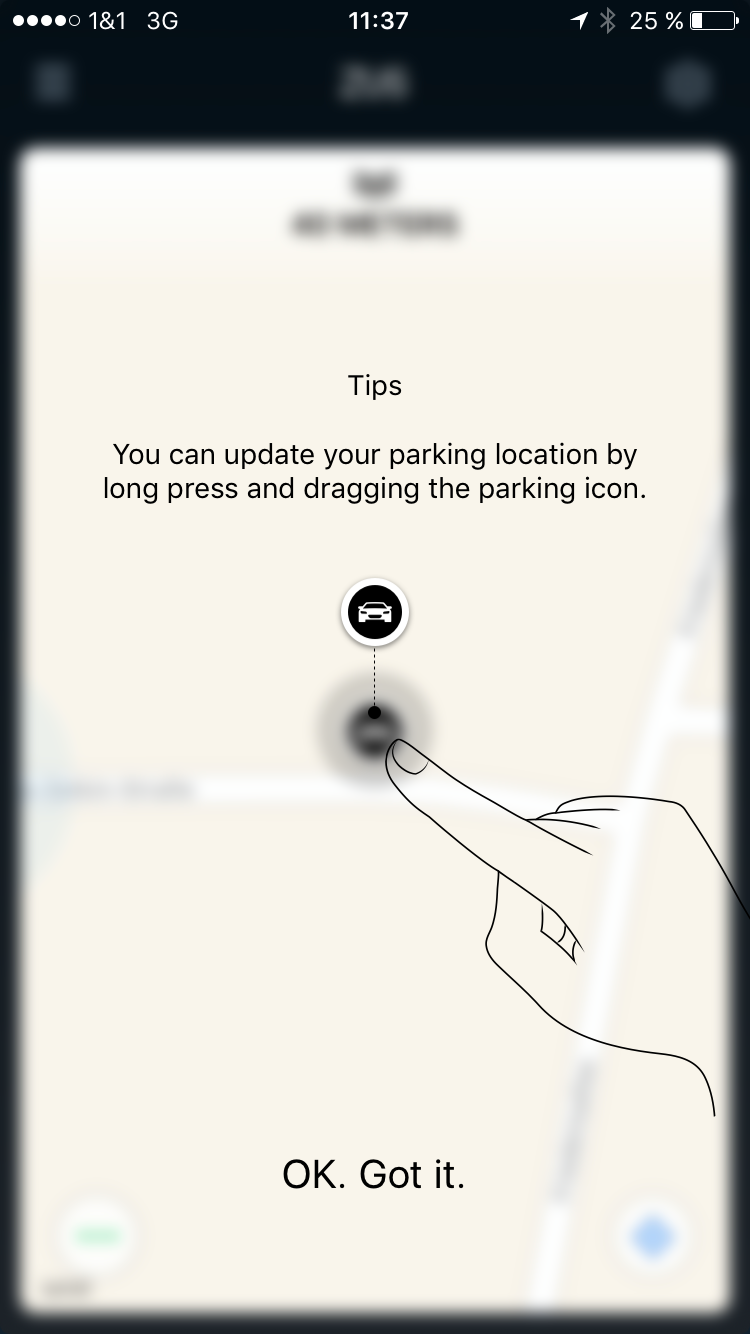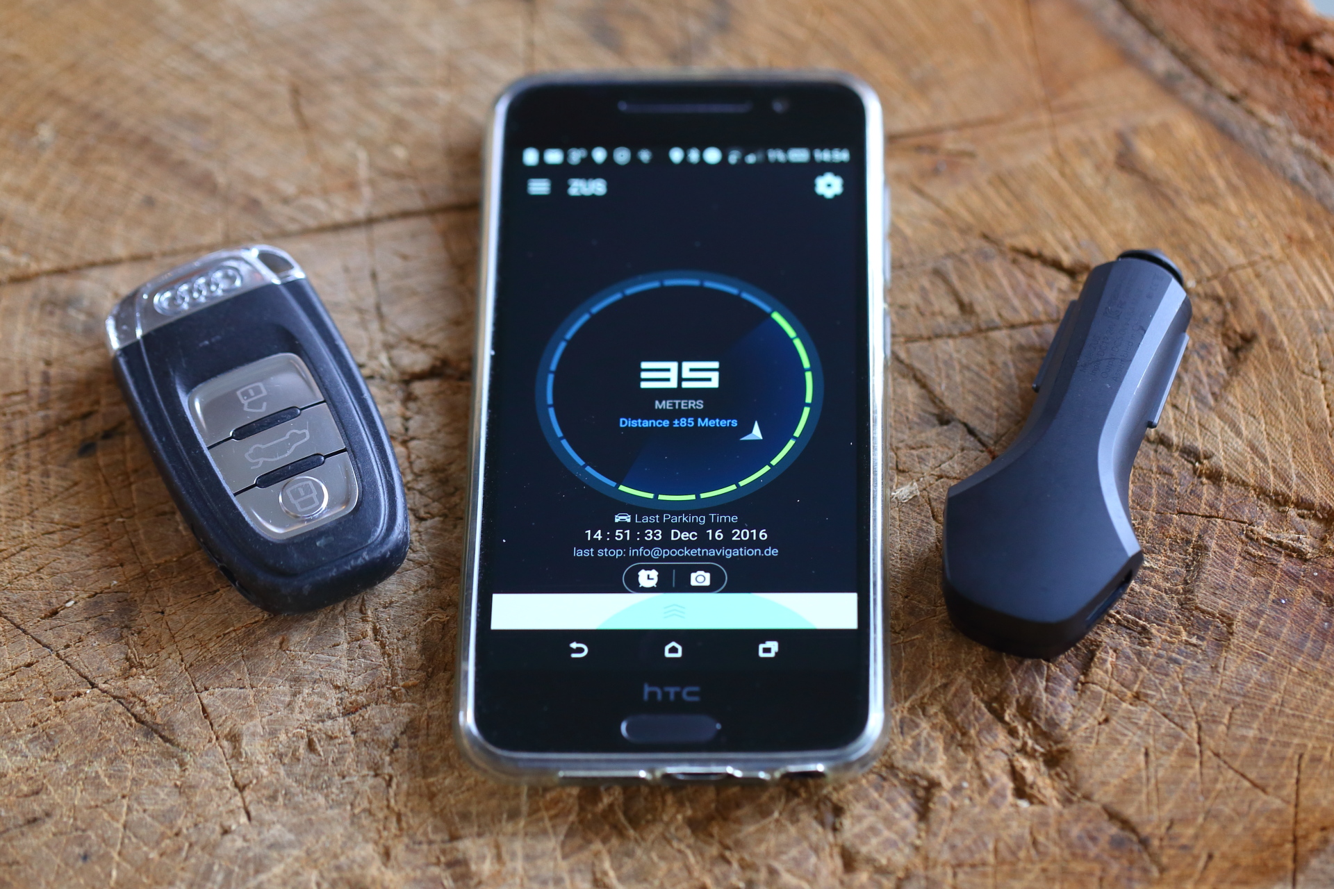 Die Bluetooth-Verbindung dient nicht nur dazu, die Spannung der Autobatterie an die App auf dem Smartphone zu senden (dazu später mehr), wird der Motor des Fahrzeugs abgestellt, speichert der Adapter automatisch die aktuelle Parkposition. Wird die Verbindung getrennt, weil sich der Fahrer zu weit mit seinem Smartphone vom Adapter entfernt hat (etwa 10 – 15 Meter), benachrichtigt die App den Fahrer automatisch, dass eine gespeicherte Parkposition vorhanden ist. Um wieder zum Fahrzeug zurückzufinden, genügt es die ZUS-App zu öffnen und in Richtung des Pfeiles, der auf dem Hauptbildschirm angezeigt wird, zu laufen. Vom unteren Teil der App kann auch eine Karte geöffnet werden, die sowohl die eigene Position als auch die des Fahrzeugs anzeigt. Eine Routenberechnung oder Navigation zum Parkplatz ist leider nicht möglich. Praktisch: Zu jeder Parkposition kann auch ein Foto abgespeichert und ein Timer gesetzt werden, mit dem man beispielsweise auf den Ablauf eines Parkscheins oder der Parkuhr erinnert wird.