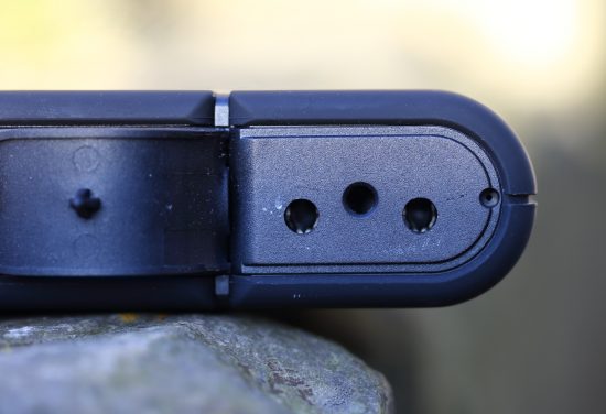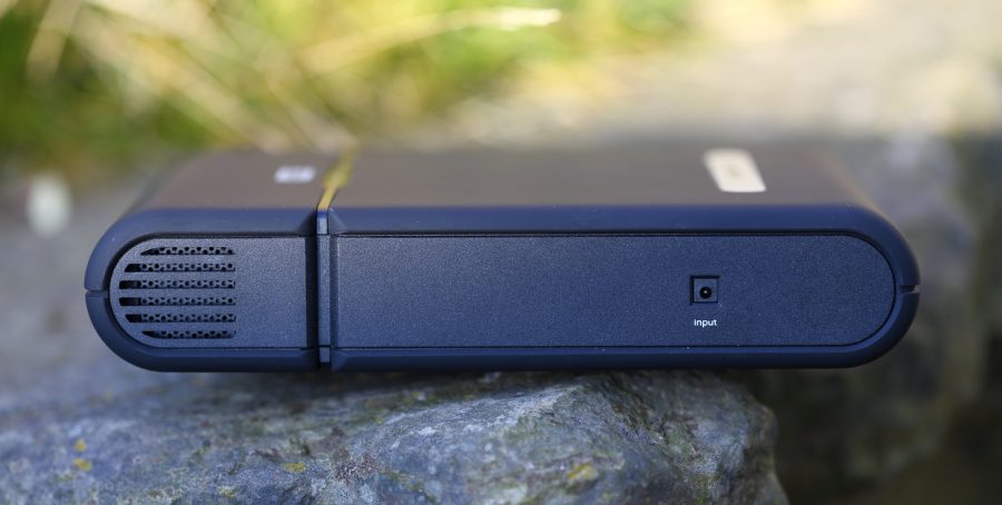 Das schwarze Gehäuse besteht aus leicht gummiertem Kunststoff und ist damit schön griffig, allerdings auch etwas anfällig für Kratzer. An der Oberseite zeigen acht blaue LEDs auf Knopfdruck den Ladezustand des Akkus an. Der 220 Volt starke AC-Ausgang ist über eine Buchse Typ J ohne Schutzkragen realisiert und kann damit sowohl Euro-Stecker als auch Konturen- und Schuko-Stecker aufnehmen. Der Ausgang wird durch eine Gummikappe geschützt. Aktiviert wird er über einen seitlichen Taster, welcher aus Sicherheitsgründen mind. 7-8 Sekunden gedrückt werden muss.