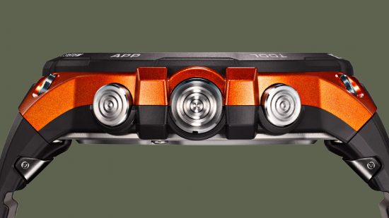 Unter der Tool-Taste folgt auf der rechten Seite der Uhr die Power Taste. Mit dieser kann die Uhr in den stromsparenden monochromen LCD-Modus wechseln. Der Clou ist dabei ein 1,32-Zoll-Dual-Layer-Display. So befindet sich unter dem Farb-TFT-LCD mit den kräftigen Farben und der scharfen Darstellung mit 320×300 Pixel für Karten und Co. ein weiterer Bildschirm. Werden die Apps oder Benachrichtigungsfunktionen eine Weile nicht mehr verwendet, schaltet die Uhr automatisch in den monochromen Modus. Dadurch soll die Akkulaufzeit laut CASIO auf bis zu einen Monat hochgeschraubt werden können. Bei normalen Gebrauch wird die Batterielebensdauer mit mehr als 1 Tag angegeben, was wiederum nach Verwendungsweise variiert.