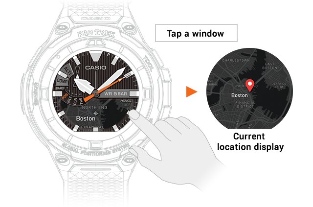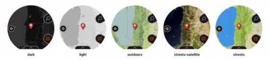 Um bei der neuen Farb-Karten Funktion nicht auf Mobilfunk- oder Internetverbindung angewiesen sein zu müssen, können die benötigten Karten vorab heruntergeladen werden. Die auf OpenStreetMap basierenden Kartendaten bezieht Casio von Mapbox. Je nach Einsatzzweck können 5 verschiedene Kartendarstellungen ausgewählt werden.