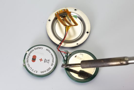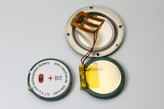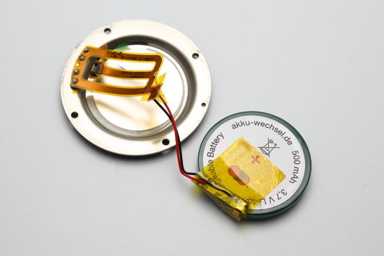 Nachdem die Schrauben entfernt sind, kann die Rückseite leicht gelöst werden. Dabei muss man sehr vorsichtig vorgehen, denn der Akku ist auf der Rückseite verklebt. Die Steckverbindung befindet sich auf der Platine der Uhr und muss vorsichtig, z.B. mit einem Fingernagel gelöst werden.