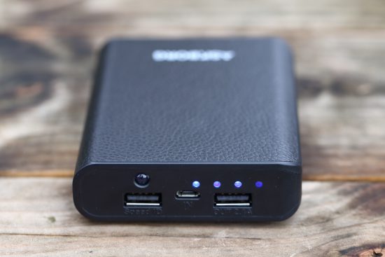 Die 10400mAh Powerbank hat eine Oberfläche, welche an Kunstleder erinnert und wirkt damit unserer Meinung nach etwas altmodisch, ist aber auch etwas Besonderes. Der Ladezustand wird ebenfalls über 4 blaue LEDs angezeigt. Die LEDs sind bei unserem Testgerät nicht mittig hinter den Aussparungen platziert und wirken damit unterschiedlich hell. Dieser Umstand schränkt zwar die Funktion nicht ein, sieht aber nicht gut aus.