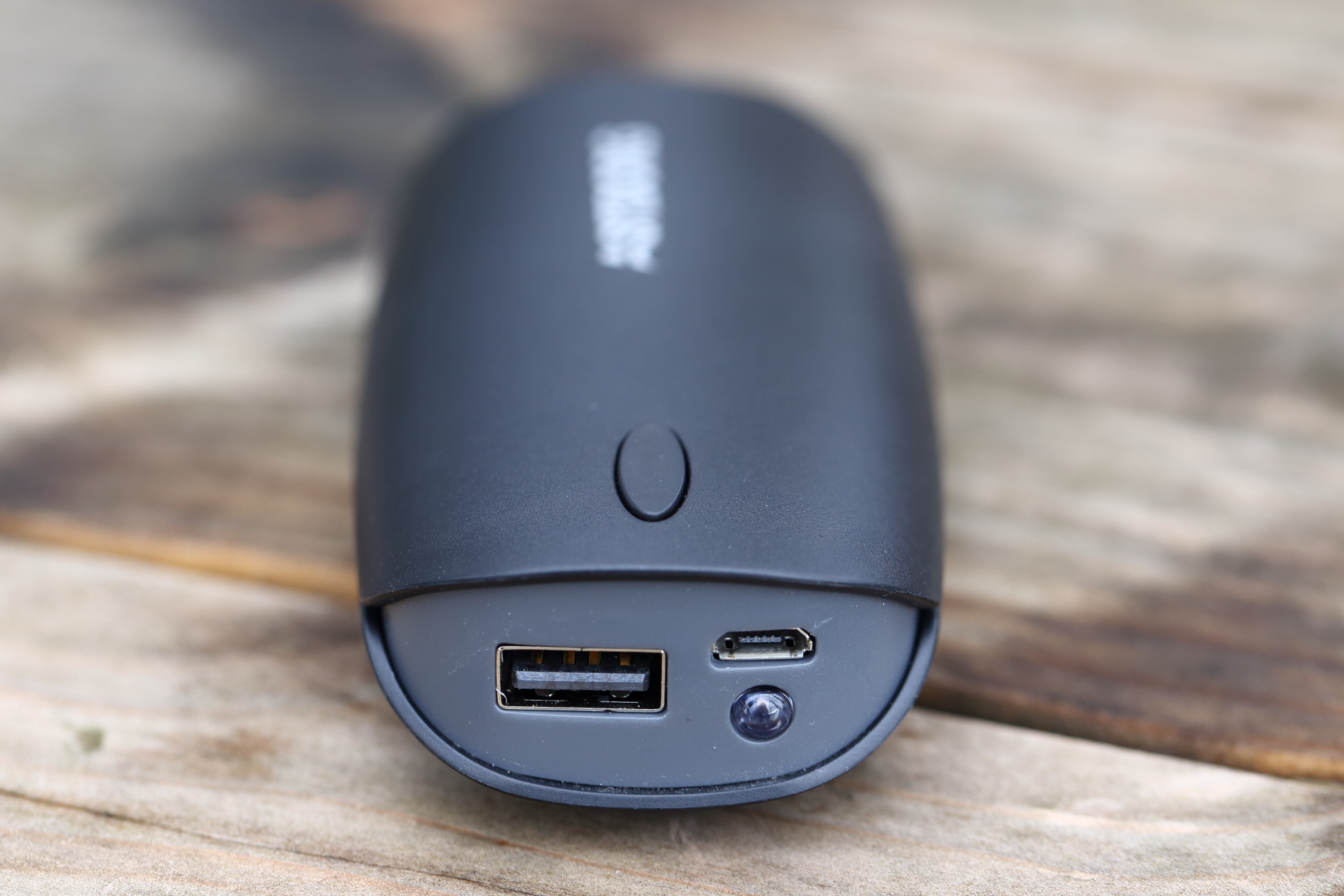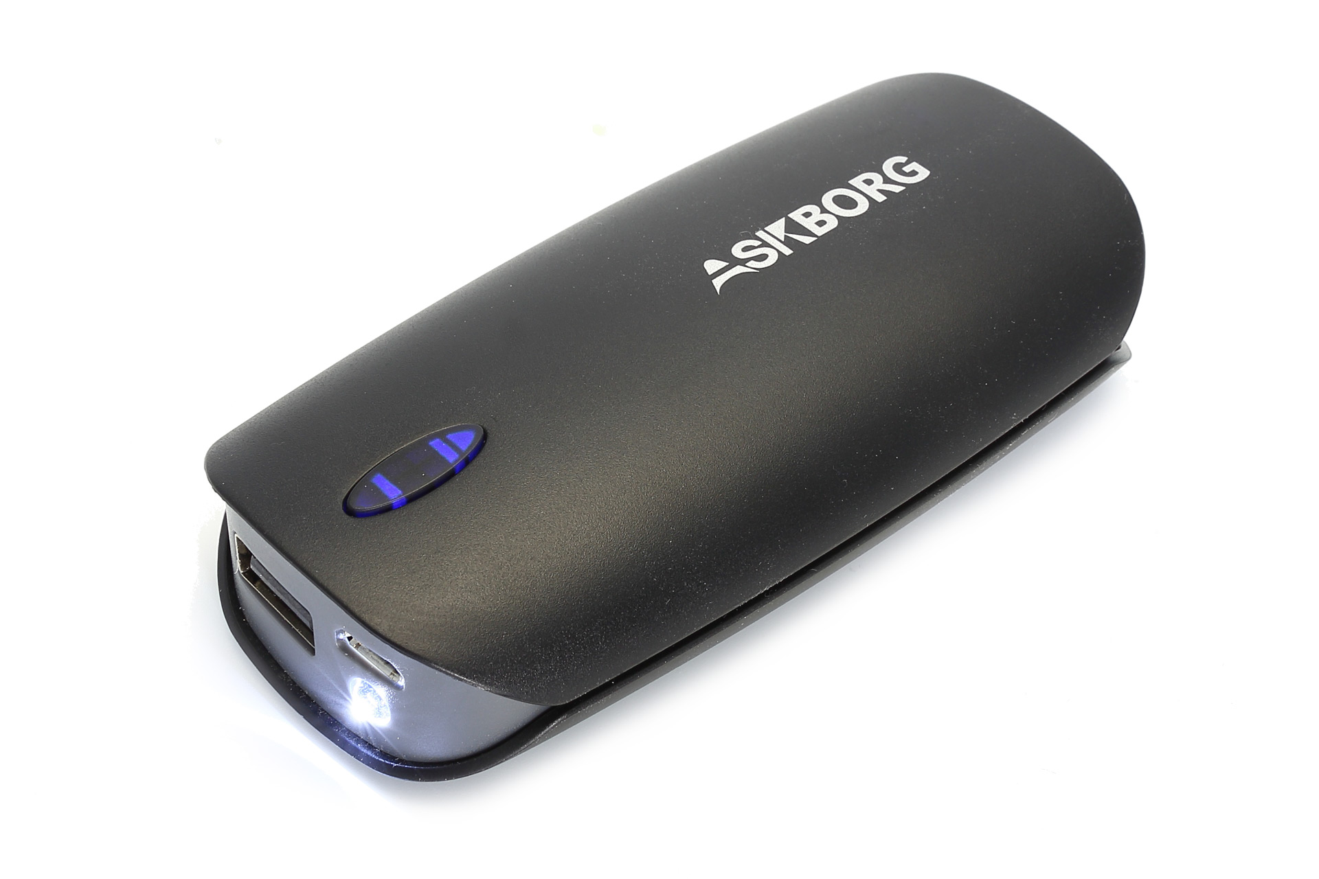 Die kleine 5200mAh Powerbank ist aus robustem Kunststoff gefertigt, passt dank der abgerundeten Form perfekt in eine Hosentasche und macht insgesamt einen soliden Eindruck! Der Ladezustand wird über 4 blaue LEDs angezeigt, welche sich unter dem Taster verbergen. Über den Taster können der Ausgang und das kleine LED-Notlicht aktiviert werden.