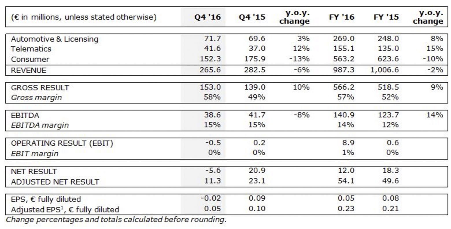Das Jahr 2016 brachte TomTom somit einen Gewinn von 12 Millionen Euro. Im Jahr 2015 lag dieser noch bei 18,3 Millionen Euro, was einen Rückgang von 34,4% bedeutet.