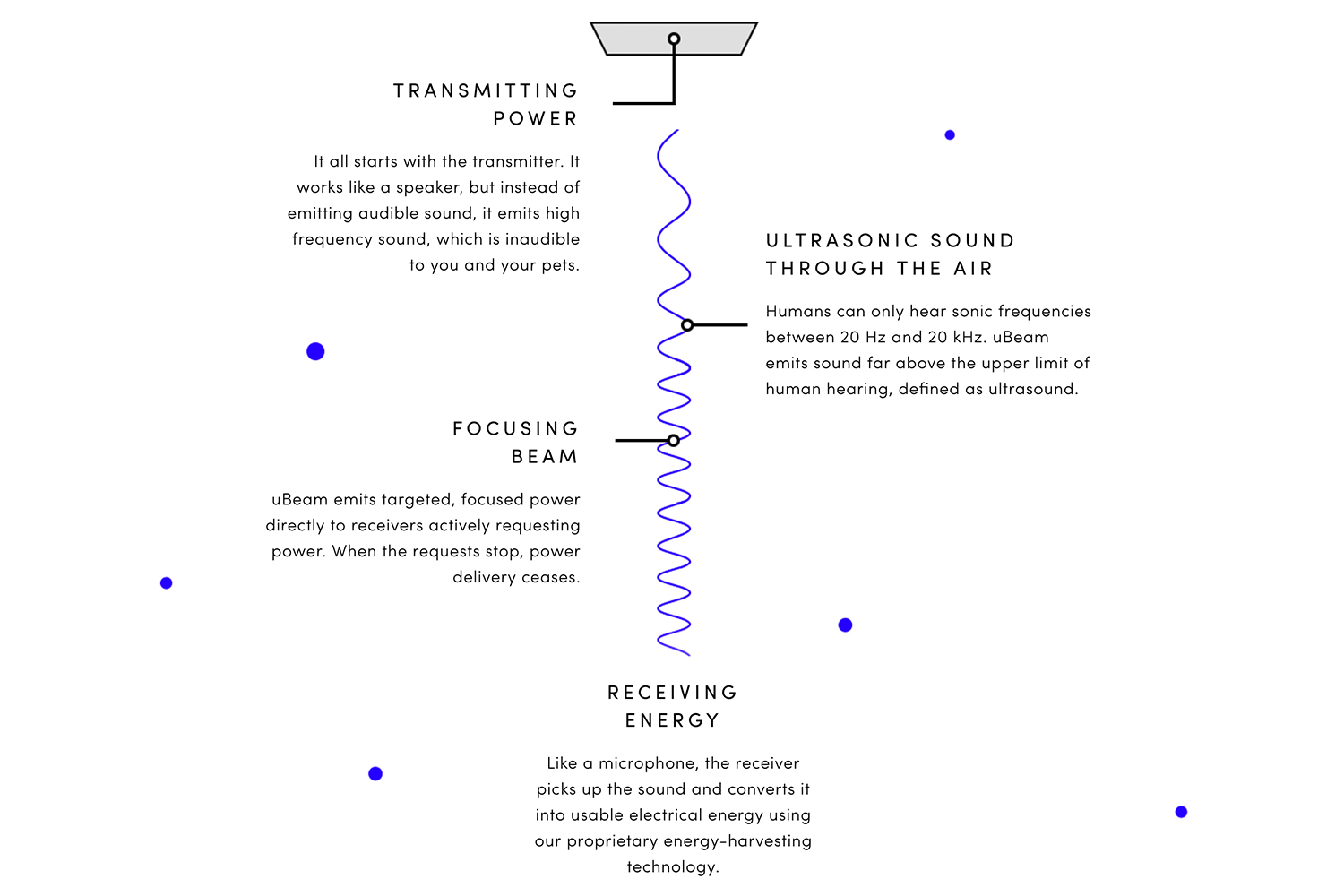 Mit 21 Jahren gründete Meredith Perry, Studentin an der University of Pennsylvania, das Unternehmen uBeam. Ihre Vision ist es, elektrischen Strom auch ohne Kabel über längere Strecken zu übertragen. Drahtloses Laden beherrschen schon jetzt viele Smartphones, allerdings kommt dabei eine induktive Übertragung zum Einsatz, welche nur wenige Millimeter überwinden kann. Um drahtlos zu laden, muss das Smartphone bei dieser Technik allerdings, wie auch von elektrischen Zahnbürsten bekannt, auf einer Ladestation liegen.