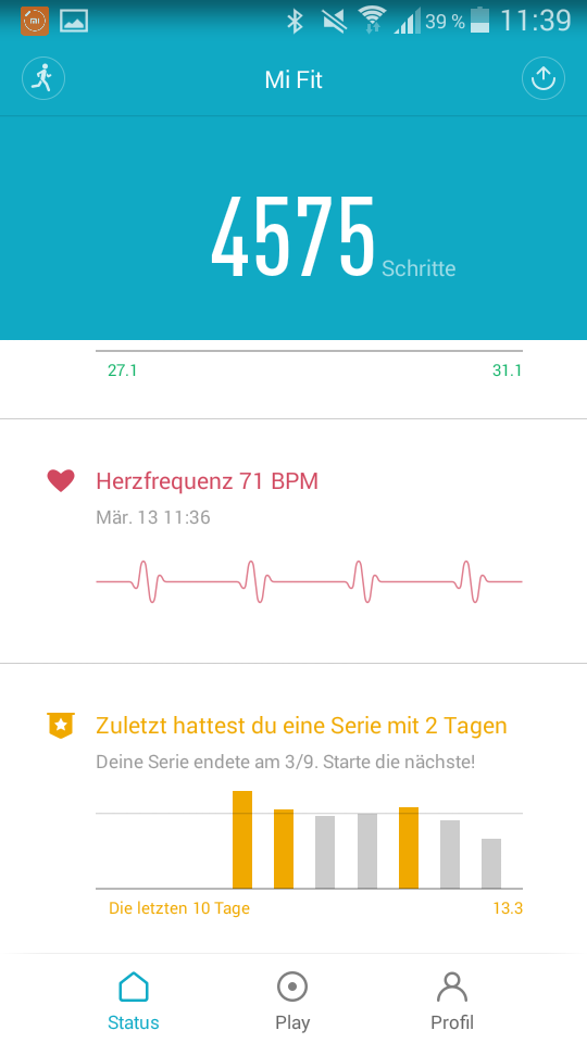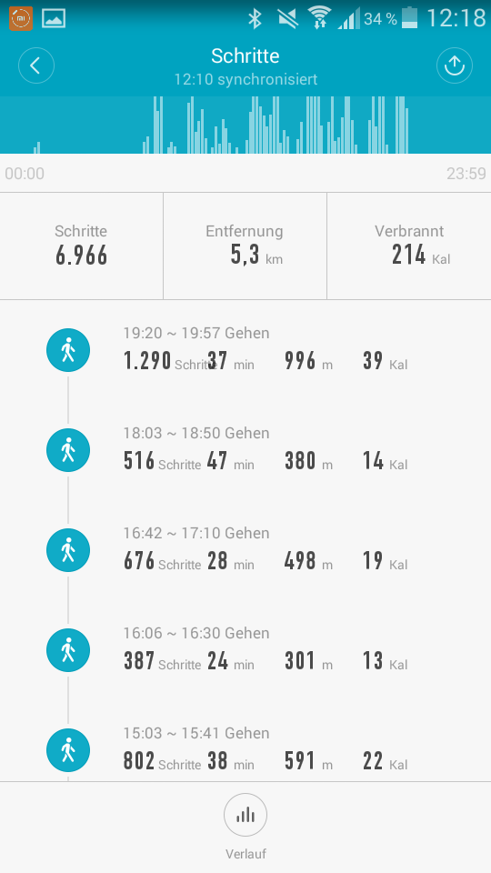 In der App werden die Schritte direkt auf dem Startbildschirm als Kreis dargestellt. Drückt man auf diesen gelangt man auf die tägliche Übersicht. Anhand eines Säulendiagramms repräsentiert jede Säule 10 Minuten. Durch ein Finger-Over kann die entsprechende Zahl der Schritte für die jeweilige Säule eingesehen werden. Erkennt der Tracker zusammenhängende Bewegungen, werden diese in einer Tabelle unter dem Diagramm aufgelistet. Auch Angaben zur Distanz und dem jeweiligen Kalorienverbrauch werden genannt. Bisher unterscheidet das Mi Band 2 automatisch zwischen Gehen und Laufen. Wird eine Laufaktivität erkannt, wird diese als „Aktivität“ deklariert und mit einem anderen Symbol dargestellt. Die automatische Erkennung der „Aktivität“ funktionierte leider nur selten. Ein manuell aktiviertes Lauftraining fällt leider völlig aus der Auflistung heraus und erscheint nur als Säule im Diagramm, mit der Schrittanzahl beim Finger-Over. Details zu den manuell aktivierten Lauftrainings müssen im separaten Trainingsbereich abgerufen werden. Dazu weiter unten mehr.