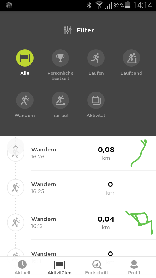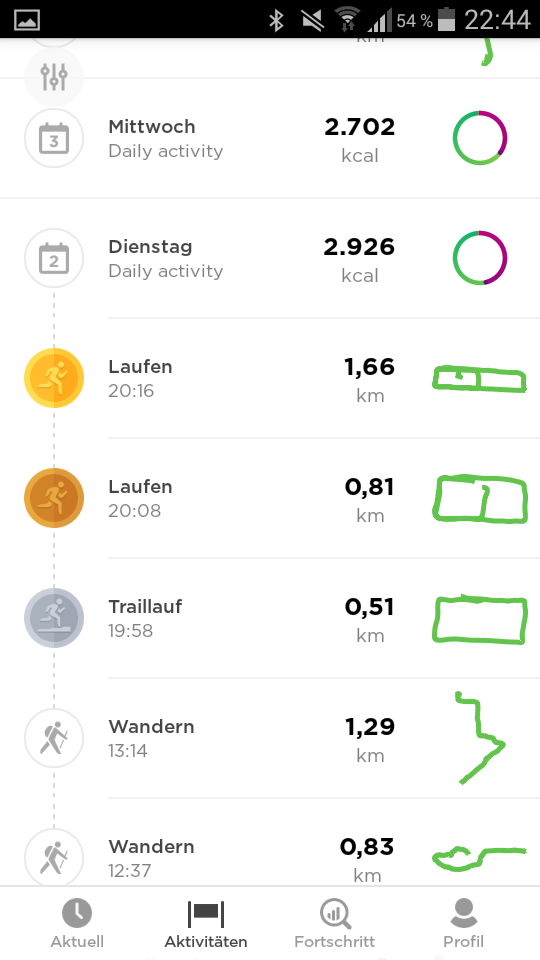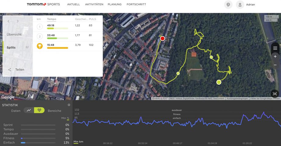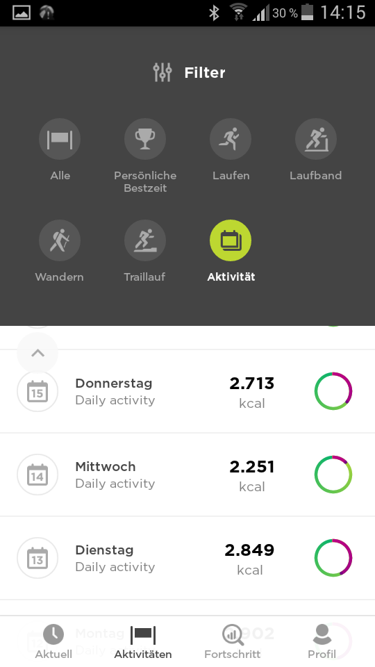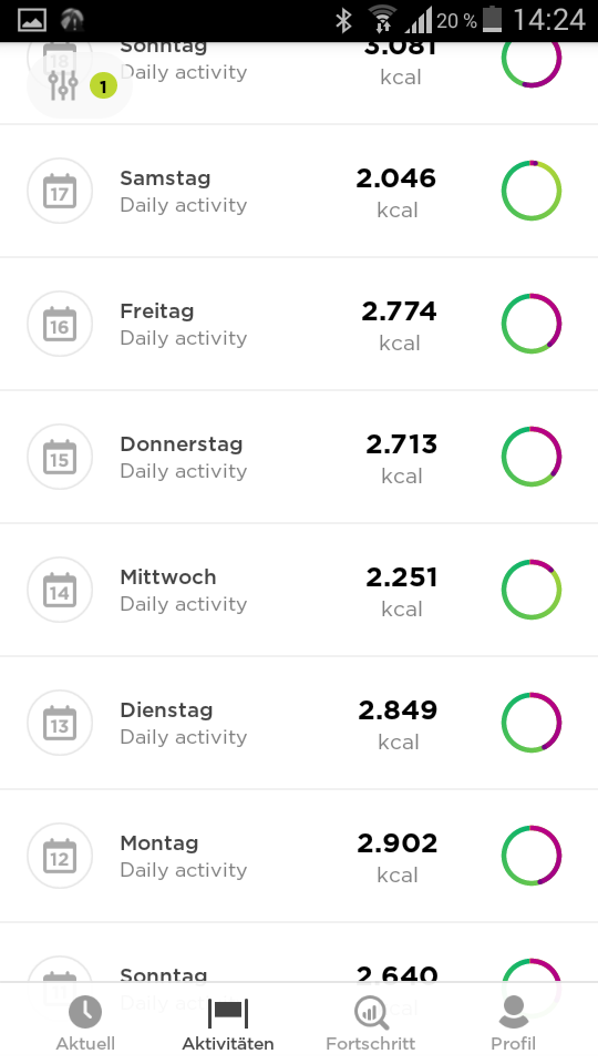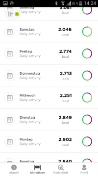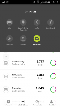 Bei den Vergleichsmöglichkeiten hat TomTom mittlerweile sichtlich nachgebessert. Mit Hilfe des Reiters Aktivitäten können nun die Fitness-Werte verschiedener Tage zügig miteinander verglichen werden. Möglich geworden ist dies durch die zusätzliche Auflistung der „Daily Activity“ [= Tägliche Aktivität] innerhalb der Aktivitätenliste.