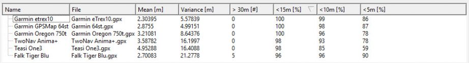 Betrachtet man nur die mittlere Abweichnung (Mean), kommt das Falk Tiger Blu dem eTrex 10 mit nur 2,7 Metern mittlerer Abweichung erstaunlich nahe. Sogar 90 Prozent der Trackpunkte sind genauer als 5 Meter. Schaut man sich den Track des Tiger Blu jedoch auf der Karte an, sieht man sofort einen extremen Ausreißer von einigen hundert Metern, welcher unter schwierigen Empfangsbedingungen aufgetreten ist (nahe der Hauswand, starke Abschattung). Solche Ausreißer sind fatal, da sie die Tracklänge massiv verfälschen. Unter schwierigen Empfangsbedingungen und kurz vor dem Signalverlust sorgt normalweise ein Filter dafür, dass solche Sprünge nicht im Track aufgezeichnet werden. Der Filter des Tiger Blu scheint wenig zuverlässig mit solchen Bedingungen umzugehen. Aber auch im Bereich der Kernwende (ganz im Nordwesten des Tracks) fehlen dem Track knapp 100 Meter. Von den beiden schwerwiegenden Fehlern abgesehen, ist der Falk Tiger Blu Track sehr ordentlich, was auf eine gute Hardware schließen lässt, die leider von der Software öfters im Stich gelassen wird.