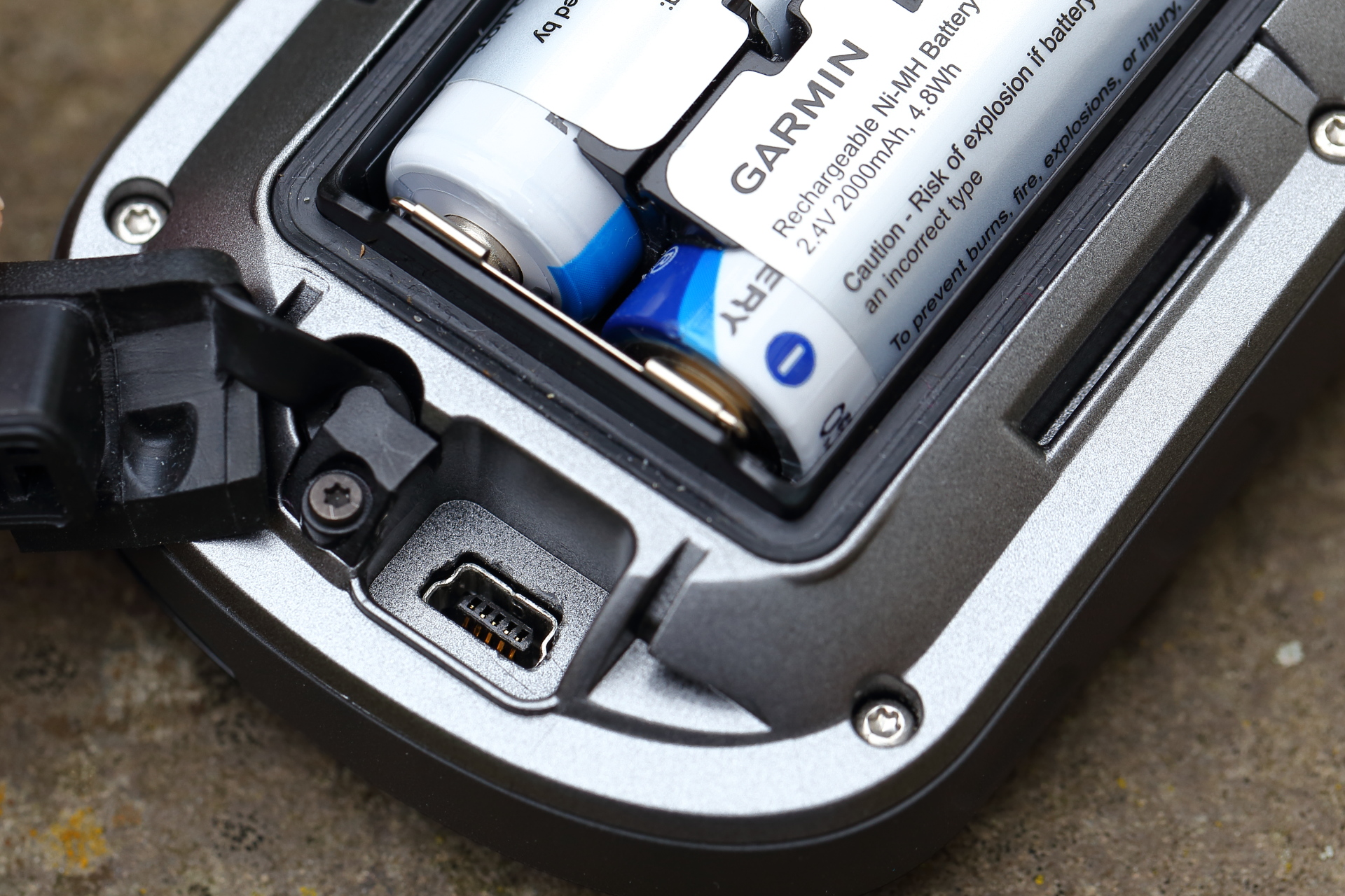 Neben der Laufzeit haben wir auch gemessen, wie lange es dauert, die Outdoor Navis wieder voll aufzuladen. Die beiden Garmin-Geräte können den Garmin NiMH Akkupack im Gerät über USB aufladen, da der Akkupack einen kleinen Tastschalter an der Geräteunterseite eindrückt und dem Gerät daher signalisiert, dass ein Garmin Akkupack eingelegt ist. Dieser Schutz ist nötig, damit nicht aus Versehen Einwegbatterien geladen werden. Mit einem kleinen Stück Pappe unter den Akkus können aber auch herkömmliche NiMH-Akkus im Gerät geladen werden.