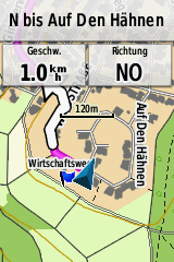 Als visuelle Navigationshilfe dient lediglich eine textliche Anweisung, die aber inhaltlich oft zu unpräzise ist, sowie ein simpler Pfeil, welcher in die Richtung zeigt, in die die Route oder der Track verläuft. Eine symbolische Darstellung einer Kreuzung ist nicht vorhanden, was inbesondere bei schnelleren Bewegungsarten, wie z.B. Radfahren, die Navigation erschwert. Die Darstellung der Route auf der Karte wird zwar durch Pfeile unterstützt, allerdings überdecken diese häufig wichtige Karteninformationen und erschweren daher die Navigation. Unterstützt wird letztere durch unterschiedliche Töne beim Erreichen von Wegpunkten, bzw. bei Kursversatz. Das Verstehen und Festlegen der Töne erfordert Einarbeitung.