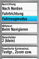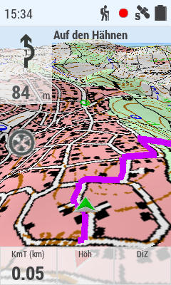 Die Darstellung der Karte kann in 2D/3D und 3D+ sowie in Fahrt- oder Nordrichtung eingestellt werden. Die Nutzung der 3D+ Karten setzt die Installation einer sog. Reliefkarte voraus. Die Möglichkeiten die Kartendarstellung anzupassen sind extrem umfangreich, inkl. einer automatischen Neigung der Karte von 2D zu 3D+ durch das Neigen des Gerätes. Um allerdings eine gut aussehende und brauchbar interpretierbare 3D+ Reliefkarte darzustellen, benötigt man eine gute Einarbeitung in die Optionen, inkl. der Nutzung von Überhöhung, Schattierung, höhere Renderqualität usw..
