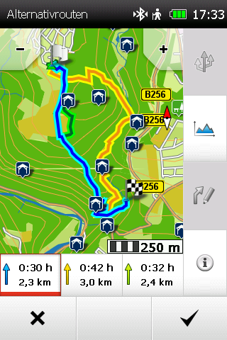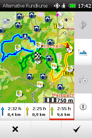 Bei Fahrzeug-Navis mittlerweile schon Standard, bieten auch einige Outdoor-Navis (Falk und Teasi) alternative Routen an. Besonders gelungen ist die Umsetzung dieser Alternativrouten beim Falk Tiger Blu. Während beim Teasi One 3 eXtend die Routenverläufe der Alternativen oft sehr ähnlich sind, bietet das Falk Tiger Blu sehr differenzierte Alternativen. Beide Navis zeigen die Alternativen graphisch ansprechend an, was die Auswahl erleichtert.