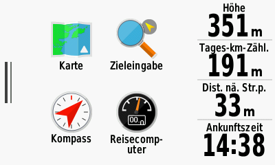 | Routen | ![]() Routen aus: - Wegpunkten - Adresse - Sonderziele - Karte - Koordinaten - letzte Ziele - Tracks Route vorab berechnen Route ziehen Rundkurs (Distanz/Dauer) Alternativrouten Routenprofile Routenoptionen: - flach - bergig - kurz - Luftlinie Routenausschlüsse: - Wanderwege - Klettersteige - Pfade - Treppen - Fähren - Tunnel ReRouting | ![]() Routen aus: - Wegpunkten - Adresse - Sonderziele - Karte - GeoCache - letzte Ziele Route vorab berechnen Route auf Karte planen Routenprofile Routenoptionen: - kurze Zeit - kurz Distanz - Geringer Anstieg Routenausschlüsse: - Unbefestigte Straßen - Fähren ReRouting | ![]() Routen aus: - Wegpunkten - Adresse - Sonderziele - Karte - GeoCache - Fotos - letzte Ziele Route vorab berechnen Rundkurs (Distanz) Route auf Karte planen Routenprofile Routenoptionen: - kurze Zeit - kurz Distanz - Geringer Anstieg Routenausschlüsse: - Unbefestigte Straßen - Fähren ReRouting | ![]() Routen aus: - Wegpunkten - Adresse - Sonderziele - Favoriten - Karte Route vorab berechnen Route auf Karte planen Route Freihand zeichnen Alternativrouten Routenprofile Routenoptionen: - Einfach - Kurz - Zug um Zug - Luftline Routengewichtung - Unbefestigte Straßen - Hauptstraßen - Radwege - Fähren Routenauschlüsse: - Einbahnstraßen ReRouting | Routen aus: - Wegpunkten - Adresse - Koordinaten - Sonderziel - Kurs - Favoriten - Karte Route auf Karte planen (autom. Verschieben der Karte) Routendarstellung (Breite/Farbe) Routenprofile Routenoptionen: - Zeit - Distanz - Luftline Routenausschlüsse: - Unbefestigte Straßen - Maut - Fähren Routenauschlüsse: - Einbahnstraßen ReRouting (Empfindlichkeit einstellbar) |