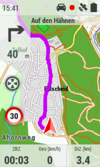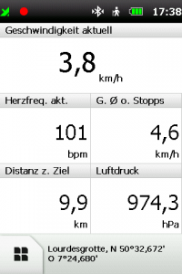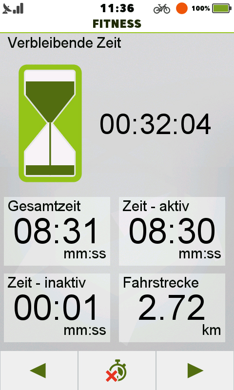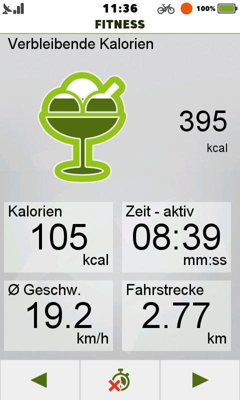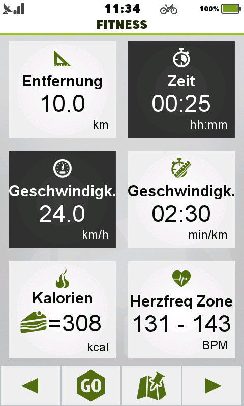 Das Teasi One 3 eXtend bietet einen interessanten Fitness-Modus, in dem man bestimmte Ziele wie Kalorien, Distanz, Zeit, Geschwindigkeit und Herzfrequenz auswählen kann und dann während des Trainings die rücklaufenden Ziele als gute Motivation visualisiert bekommt. In diesem Modus wird auch die Herzfrequenz der letzten Minuten als Diagramm angezeigt. Während der Fitness-Modus aktiv ist, kann man dennoch jederzeit in die Karte wechseln, Ziele suchen und Routen berechnen. Beim Start des Fitness-Modus wird automatisch auch die Trackaufzeichnung gestartet.