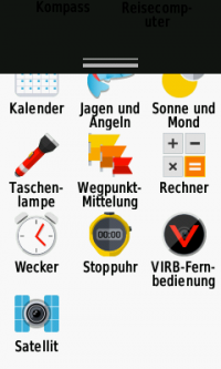 | Sonstige Apps | ![]() | ![]() VIRB-Fernbed. Stoppuhr Wecker Taschenrechner Kalender Bildbetrachter Smart Notifications | ![]() VIRB-Fernbed. Stoppuhr Wecker Taschenrechner Kalender Bildbetrachter Taschenlampe Smart Notifications IQ-Connect Apps | ![]() | |