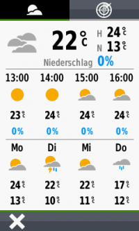 Das Garmin Oregon 750t kann über eine WLAN- oder Smartphone-Verbindung aktuelle Wetterdaten inkl. Vorhersage sowie ein Regenradar abrufen. Als Karte für das Regenradar kann jede installierte Karte verwendet werden, was diese Funktion besonders reizvoll macht.