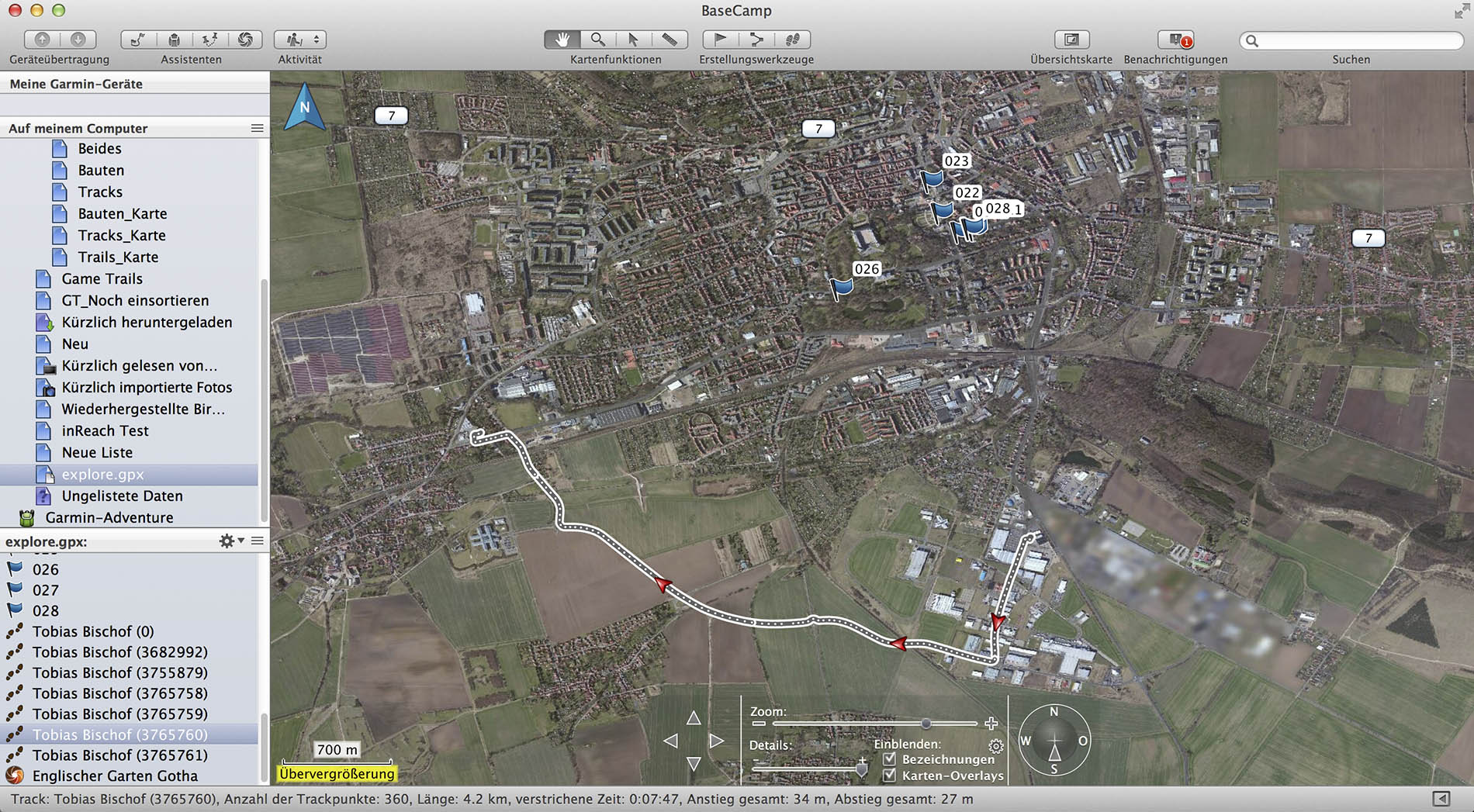 Die drei Screenshots zeigen den Export und anschließenden Import in Garmin Basecamp: