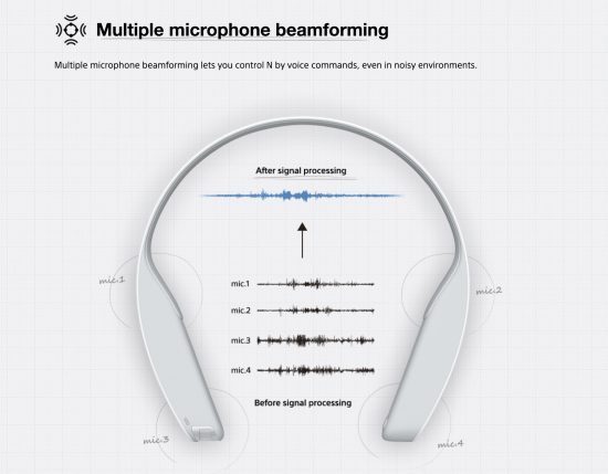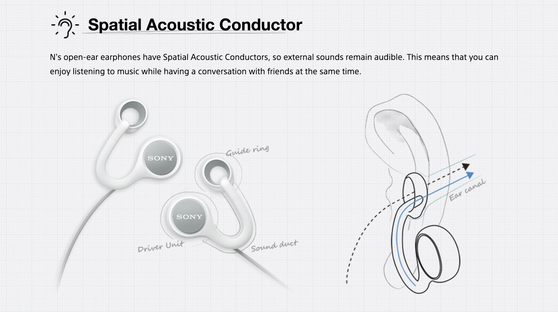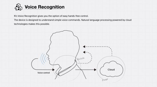 „N“ oder auch „Offene-Ohren und Freisprech Dialogsystem“ soll es seinem Nutzer ermöglichen, trotz einer Verbindung zur digitalen und vernetzten Welt wieder besser mit seiner realen Umgebung zu agieren. Das Konzept von „N“ geht deshalb weg von einem Display der den Blick zur wunderbaren Außenwelt abschneidet. Stattdessen ist die Haupteinheit eine Art offener Halsring. Sony nennt es Neckband (= Nackenring). Dieser ist ausgerüstet mit interessanter Technik. Zunächst wären die vier verschiedenen Mikrofone zu nennen. Durch zwei Mikrofone an jeder Seite, wird jeder Sprachbefehl des Nutzers viermal aufgenommen. „N“ generiert daraus einen einzigen Befehl, wodurch der Nutzer auch in geräuschvollen Umweltkontexten besser verstanden wird.