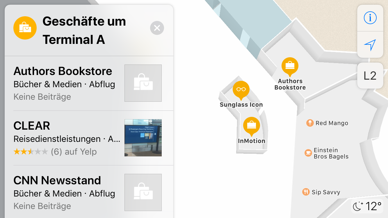 Um Verwunderungen vorzubeugen – die Innenbereichskarten liegen im Augenblick nur für ausgewählte Gebäude vor. Nach und nach wird die Anzahl der Gebäude dann erweitert werden. Sie sind sehr praktisch, wenn man sich auf einem Flughafen noch nicht gut auskennt und mal eben auf Toilette muss oder gerne wüsste, ob sein Lieblings-Cafe vor Ort zu finden ist. Die Karten sind nicht zur Navigation gedacht, sondern zur besseren Übersicht, indem die Umrisse von Geschäften, Fluren und Treppen genauer dargestellt werden.