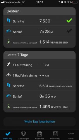 Ebenfalls mit nur einem Klick lassen sich die Aktivitätskarten dynamisch anordnen und auf der Benutzeroberfläche anheften, entfernen oder in der Reihenfolge sortieren. Auf diese Weise werden nur die Stats angezeigt, die dem Nutzer wichtig sind. Egal ob man in der einen Woche besonders auf die Schlafanalyse Wert legt und in der anderen Woche seine Laufaktivitäten tracken oder sonst anderweitige Prioritäten setzen möchte, das neue Dashboard erlaubt es nun. Der Button hierfür, Mein Tag bearbeiten, findet sich ganz unten auf der Seite.