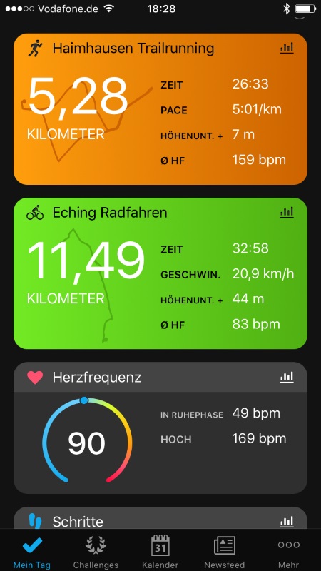Die bunten Registerkarten wirken nicht nur frisch und lebhaft, sie sind auch hilfreich für das schnelle Erkennen der Aktivitäten. Schon nach kurzer Zeit hat man sich gemerkt, welche Farbe das Laufen oder Radfahren hat. Zeitsparend ist auch der Umstand, dass sich jetzt alles auf einer Seite befindet. Man kann einfach runterscrollen, anstatt zischen den Ansichten und Tabs zu wechseln.