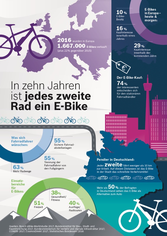 Von den insgesamt 5421 befragten Personen besaßen bereits 10 % ein E-Bike und 16 % erwogen den Kauf eines E-Bikes noch innerhalb eines Jahres. Für die Kauf-Interessenten der Bosch-Marktstudie standen dabei besonders die Kategorien E-Citybikes mit 29 % und E-Trekkingbikes mit 11 % im Fokus. Kurz dahinter gesellten sich E-Urbanbikes (9 %) und E-Mountainbikes (8 %) dazu.