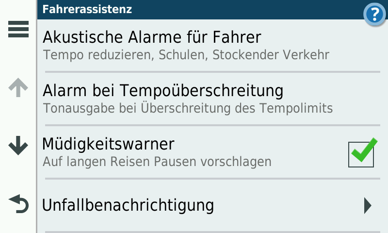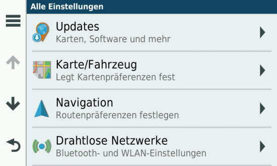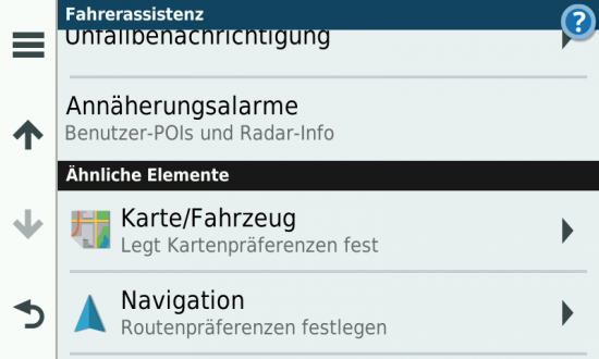 Die Aufteilung der verschiedenen Einstellungen ist etwas gewöhnungsbedürftig, kann aber erlernt werden. Jede Einstellungskategorie (bspw. Fahrerassistenz) erscheint als scrollfähige Liste. Am Ende einer jeden hat Garmin eine Anzeige von „Ähnlichen Elementen“ (bspw. Karte/Fahrzeug + Navigation) implementiert, um eine gewisse Verknüpfung der Einstellungsmöglichkeiten herzustellen. Diese Erweiterung macht die Menüführung intuitiv und verhindert, dass man sich aus den „Tiefen“ des Menüs „zurück“klicken muss.