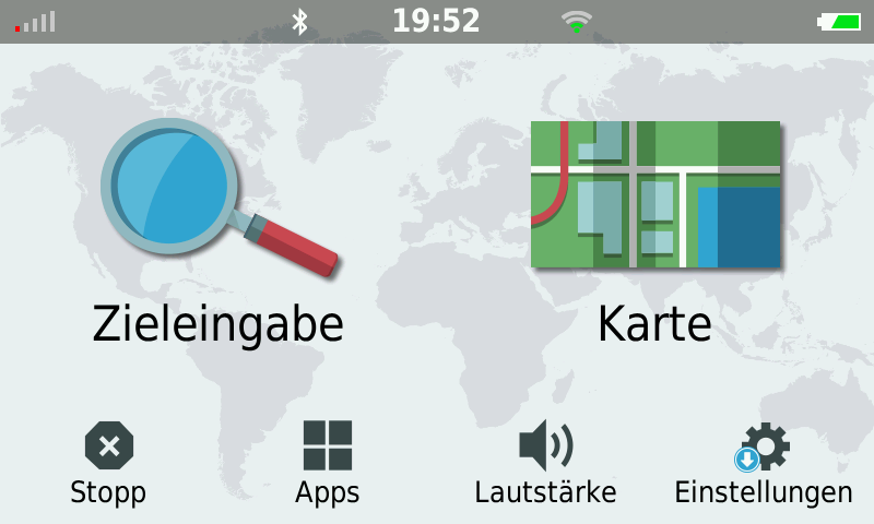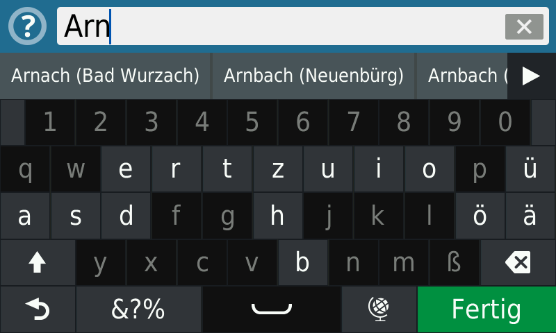 Sowohl die Symbole des Menüs als auch die einzelnen Tasten der Tastatur haben eine angenehme Größe und können ebenso von Nutzern mit großen Händen leicht bedient werden. Sucht man nach POIs oder Adressen, öffnet sich für die Eingabe das Tastaturfenster. Bei der Suche nach Adressen werden schon nach dem ersten eingegebenen Buchstaben nicht mehr mögliche Buchstabenkombinationen ausgeblendet. Die entsprechende Tastaturbelegung kann je nach Sprache in den Einstellungen festgelegt werden (Deutschland: QWERTZ).