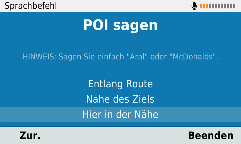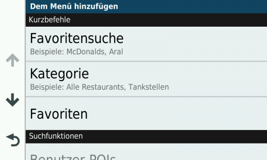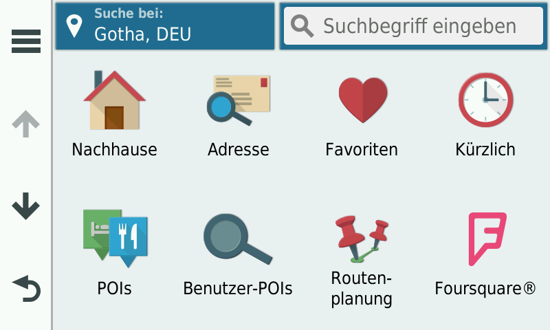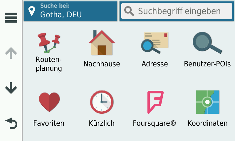 Über die Zieleingabe können neben Adressen auch Schlagwörter als Suchbegriffe eingegeben werden. Dementsprechend lassen sich gleichzeitig die Datenbanken von Foursquare, TripAdvisor (siehe auch: Interne POIs) und eigens aufgespielte POIs wie die von POIbase schnell und unkompliziert durchsuchen (siehe auch: Externe POIs).