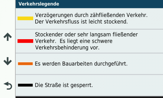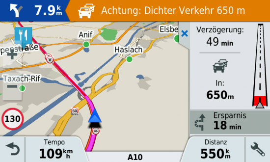 Im Navigationsmodus wird auf Staus, Baustellen und andere Verkehrsbehinderungen hingewiesen. Das hierfür eingeblendete Fenster an der rechten Seite zeigt die daraus resultierende Verzögerung (in Minuten) sowie die Länge dieser (in Metern/Kilometern) an. Während der freien Fahrt wird die Distanz zur nächstgelegenen Verkehrsbehinderung auf der Route angekündigt. Weitere Linien auf einer schematischen Straße weisen auf zusätzliche Ereignisse auf der Route hin. Will man eine detaillierte Übersicht über alle Ereignisse, muss man auf das Traffic-Fenster drücken. Die angezeigten Verkehrsvorkommen sind beim Garmin DriveLuxe 51 durch einen festgelegten Radius eingeschränkt. Bei der Nutzung des Smartphone Link sind es etwa 130 km und etwa 170 km mit DAB+ Empfänger. Werden Routen mit größeren Entfernungen berechnet, fehlen die notwendigen Verkehrsdaten.