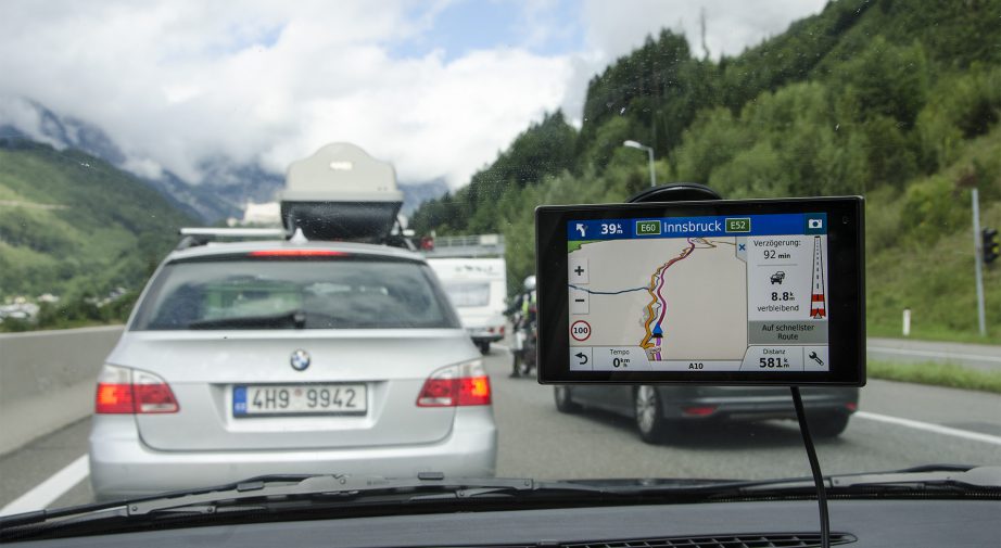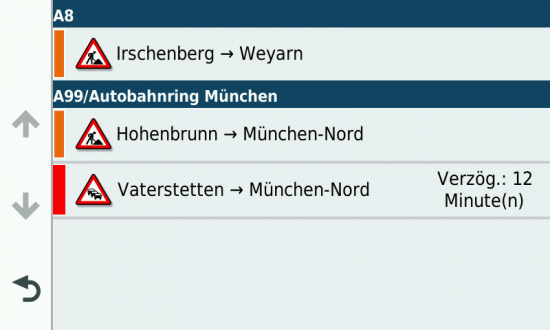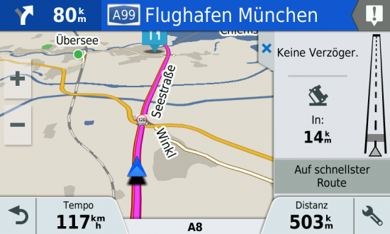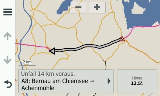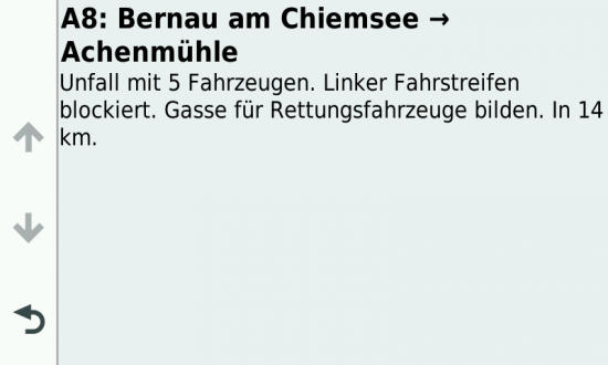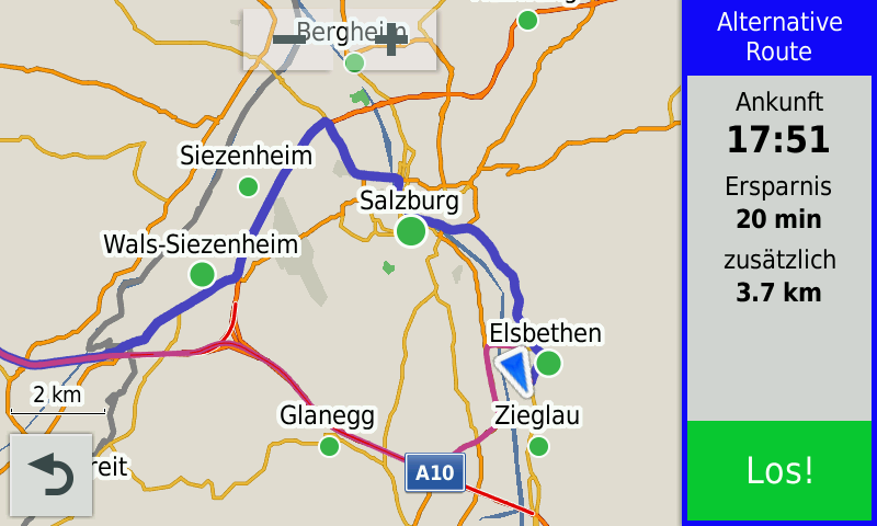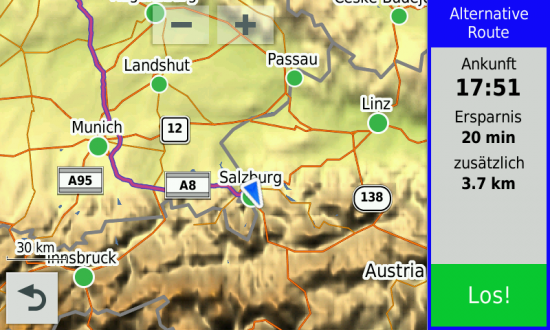 Während der fast 2000 Kilometer langen Strecke wurde nur sehr selten eine Alternativroute mit resultierender Zeitersparnis vorgeschlagen. Die unteren vier Screenshots zeigen ein Beispiel kurz vor der Grenze zwischen Österreich und Deutschland. Ursache war ein Stau am Autobahn-Grenzübergang. Unglücklicherweise führte die Alternativroute bereits vor der Grenze schon wieder auf die Autobahn. Die sinnvollere Umfahrung über Landstraßen mussten wir daher manuell navigieren.